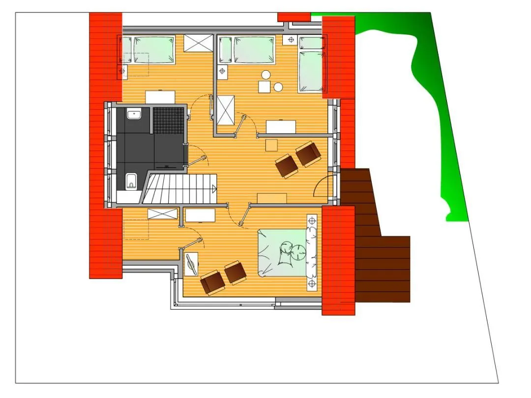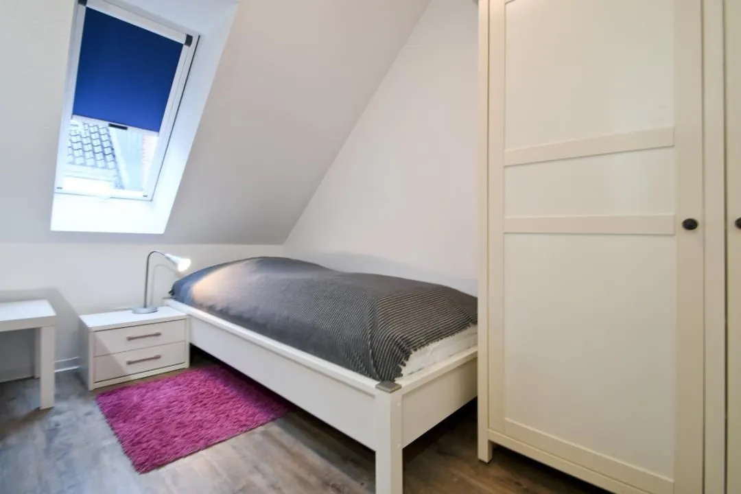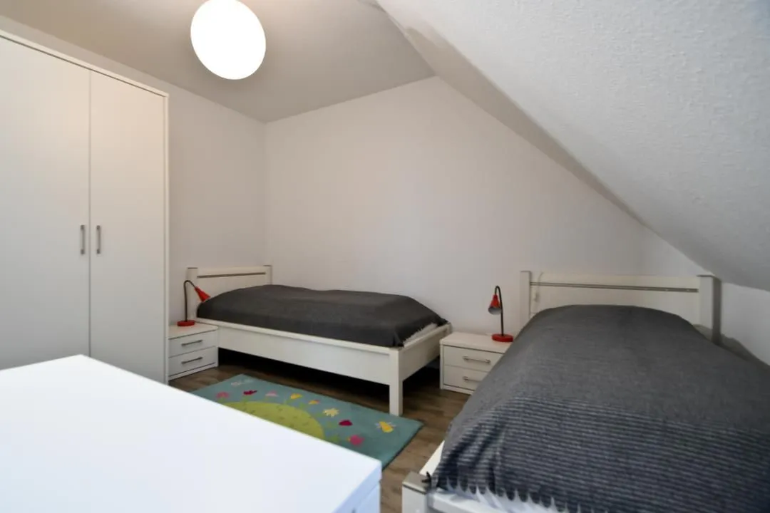 4 Schlafzimmer, 1 davon ebenerdig. Im Obergeschoss befinden sich die drei weiteren Schlafräume (ein Doppelbett, zwei Einzelbetten und ein Einzelbett) sowie ein Badezimmer. Die gemütliche Leseecke lädt zum Entspannen ein.