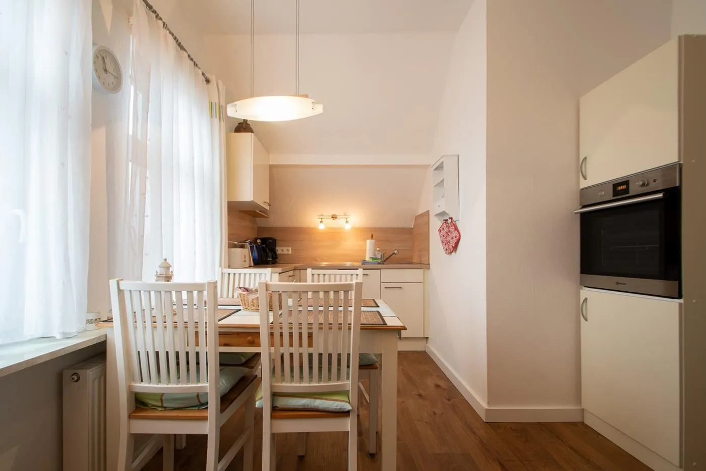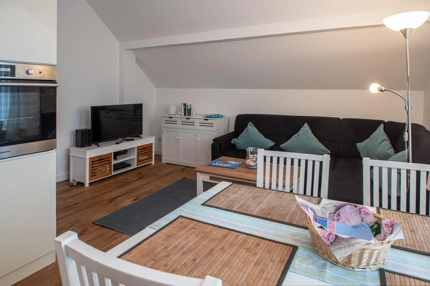 Zu dem erwartet Sie neben einem schönen Holztisch mit vier Stühlen eine hochwertige voll ausgestattet Küche mit Backofen, Cerankochfeld, Geschirrspüler, Kühlschrank, Kaffeemaschine uvm.
