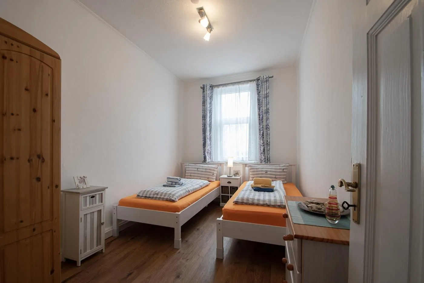 Das etwas kleinere zweite Schlafzimmer verfügt über zwei Einzelbetten, welche auch zu einem Doppelbett zusammengeschoben werden können. Auch hier finden Sie hochwertige Matratzen (je 90x200cm), zwei Nachtschränkchen und einen Kleiderschrank.