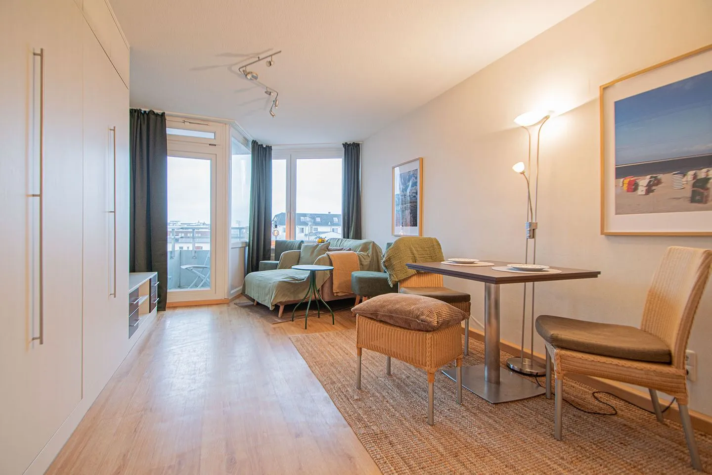 Der Balkon lädt dazu ein, die frische Nordseeluft zu genießen und Mahlzeiten oder entspannte Momente im Freien zu verbringen. Für die Zubereitung Ihrer Speisen steht Ihnen eine funktional ausgestattete Küche zur Verfügung. Sie umfasst einen 2-Platten-Herd, Mikrowelle, Kühlschrank, Spülmaschine, Kaffeemaschine und Wasserkocher. Der integrierte Essbereich ist bestens geeignet, um Ihre selbst zubereiteten Mahlzeiten bequem zu genießen.