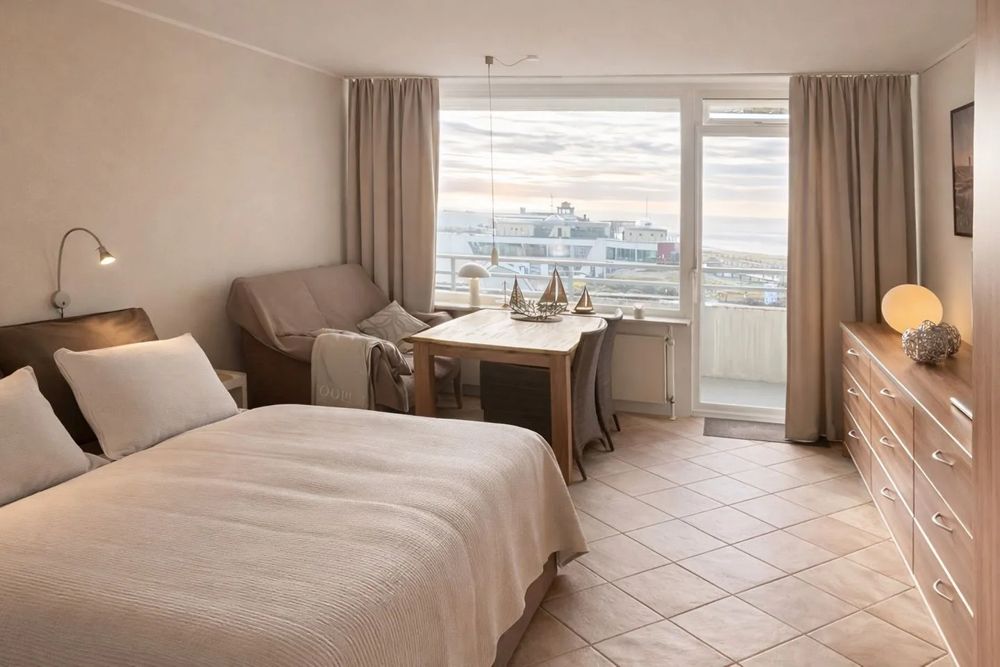 Besonders hervorzuheben ist die direkte Nähe zum Borkumer Stadtzentrum – Sie erreichen lokale Einkaufsmöglichkeiten, Restaurants und Freizeitangebote fußläufig. Für alle, die das Meer lieben, bietet sich der Strand in nur 100 Metern Entfernung an. Hier erwartet Sie ein feiner Sandstrand, der zu Spaziergängen, Sonnenbädern oder einem erfrischenden Bad in der Nordsee einlädt. Darüber hinaus haben Sie vom überdachten Südbalkon einen eingeschränkten Blick auf das Meer und können so das besondere Inselambiente in vollen Zügen genießen.
