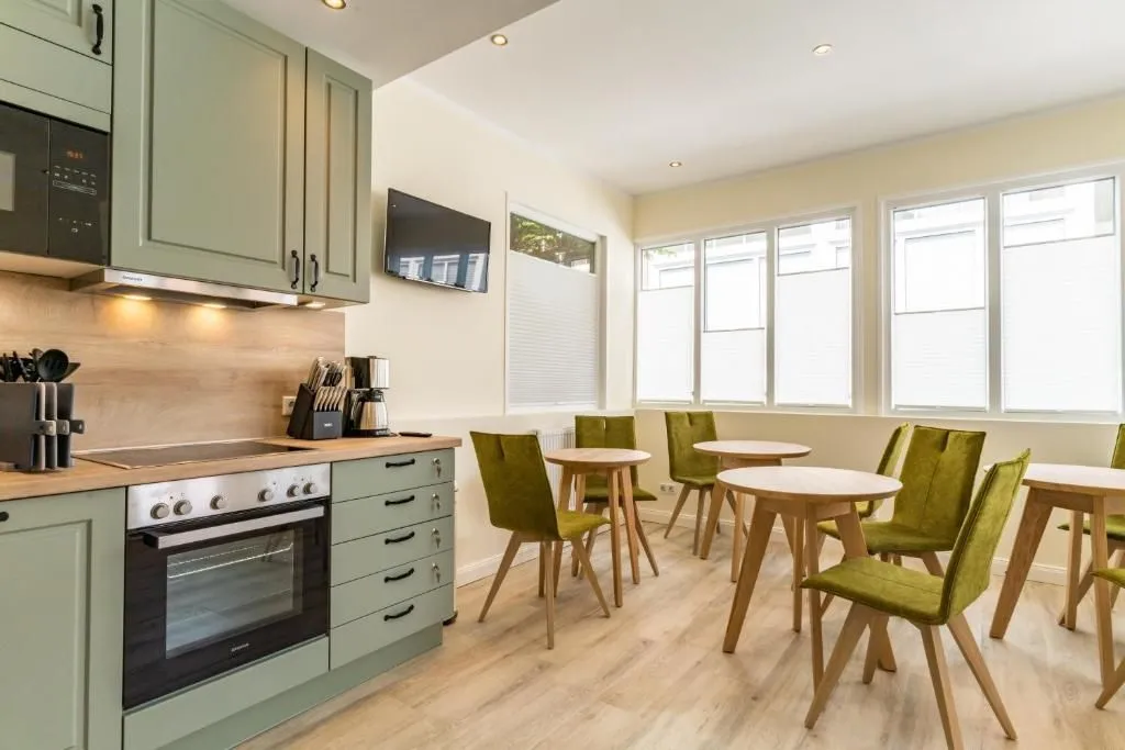 Schon beim Betreten befinden Sie sich in einem klar strukturierten Raumkonzept, das auf die Bedürfnisse von bis zu zwei Gästen zugeschnitten ist. Für die vier Einzelzimmer im Haus Emma steht eine Gemeinschaftsküche zur Verfügung. Hier finden SIe für jede EInheit einen abschließbaren, privaten Kühlschrank sowie eine Kaffeemaschine und Kochmöglichkeiten für die Allgemeinheit.