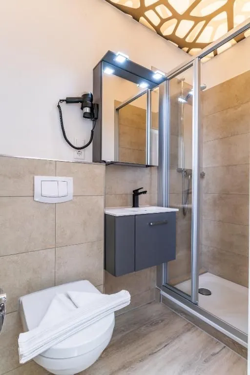 Das separate Badezimmer verfügt über eine Dusche, ein WC, ein Waschbecken, warmes Wasser und einen Spiegel – ideal für die tägliche Pflege. Ein installierter Rauchmelder gewährleistet zusätzliche Sicherheit während Ihres Aufenthalts.