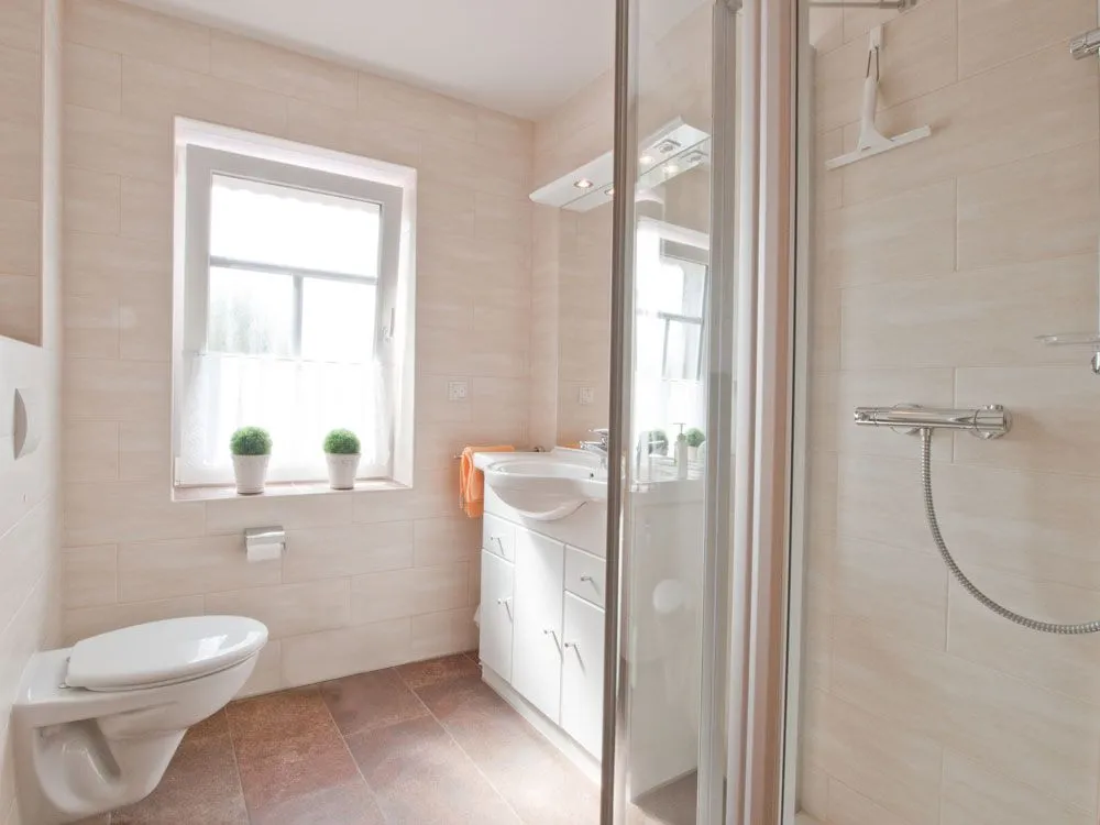 Ihr modernes Badezimmer verfügt über eine große Dusche (flacher Einstieg), ein Hänge-WC und eine Waschtischkombination mit großem Spiegel. Ein Fön ist selbstverständlich. Das Bad ist mit einer Fußbodenheizung und einem Handtuchheizkörper ausgestattet. Das Fenster ist mit elektrischen Außenrollläden ausgestattet. Sie haben die Möglichkeit, Hand- & Badetücher für jede angemeldete Person gegen Gebühr gleich mit zu buchen.