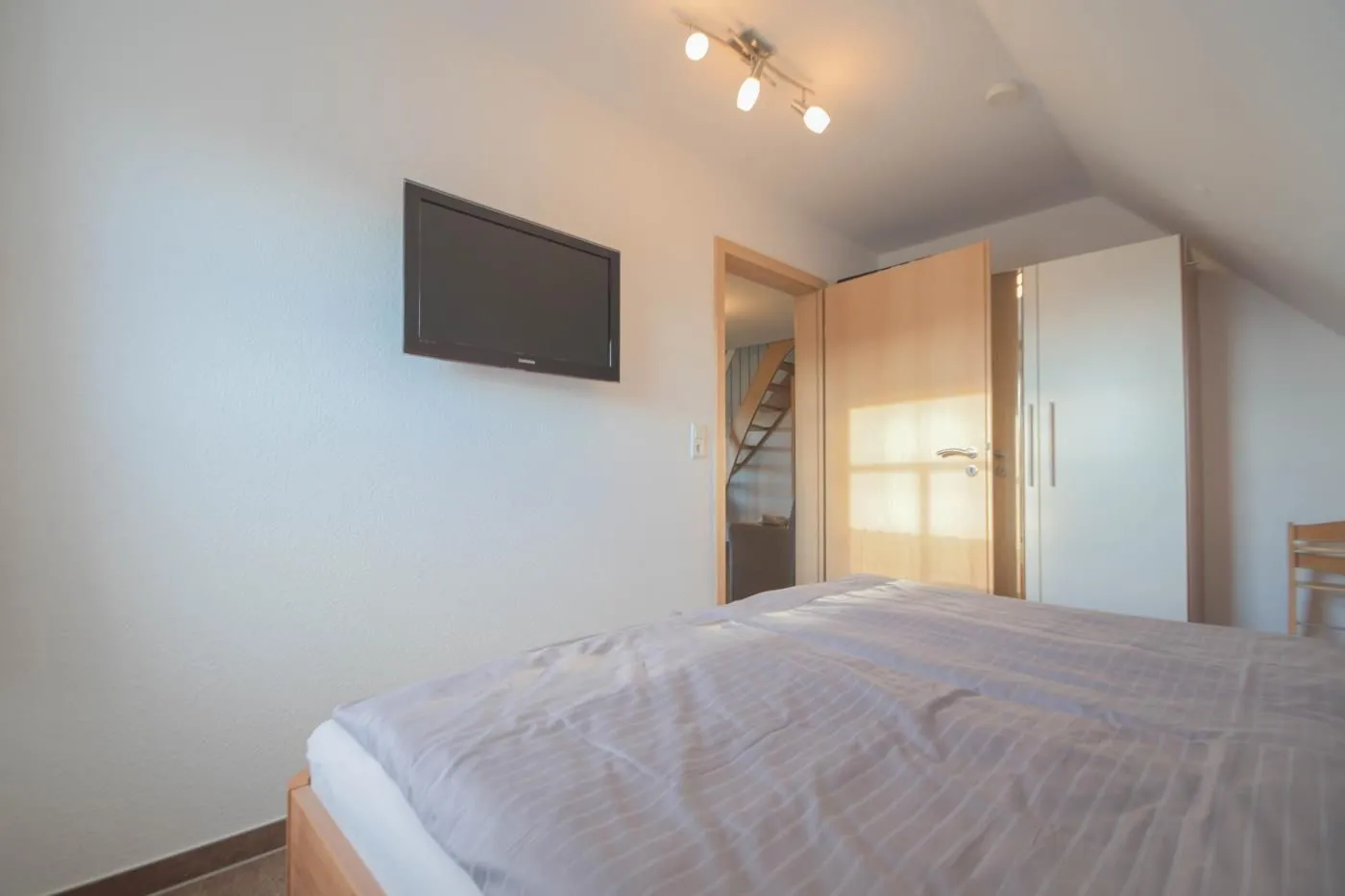 Das Schlafzimmer 1 ist mit einem Doppelbett und einem großen Kleiderschrank mit Kleiderbügeln ausgestattet. Ein Wecker & 2