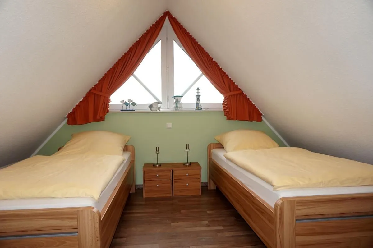 Das Schlafzimmer 2 ist mit 2 Einzelbetten und Schlafzimmerfenster mit Verdunklungsvorhängen ausgestattet. Ein Hauck Reisekinderbett ist kostenfrei zustellbar.