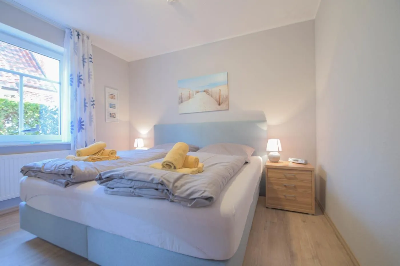 ausgestattet. Ein Wecker & 2 Nachttischlampen sind ebenfalls vorhanden. Ein Hauck Reisekinderbett ist kostenfrei zustellbar. Das Schlafzimmerfenster ist mit elektrischen Rollläden ausgestattet. Sie haben die Möglichkeit, Bettwäsche, für jede angemeldete Person gegen Gebühr gleich mit zu buchen. Oder Sie bringen einfach Ihre Lieblingswäsche von zu Hause mit. Einfach so, wie es Ihnen am liebsten ist.