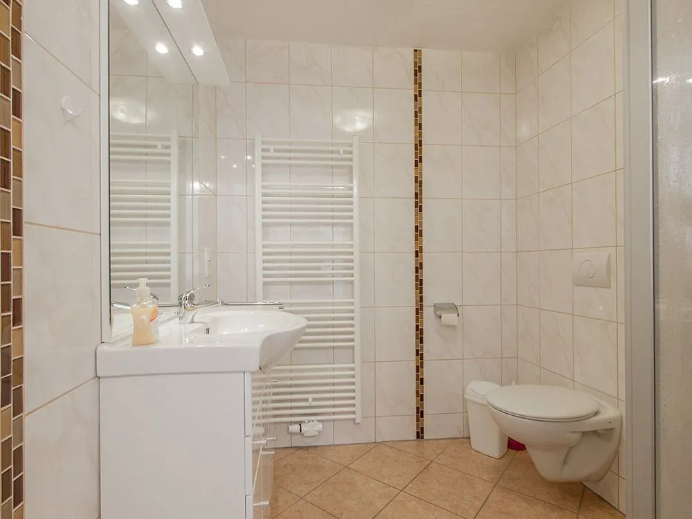 Das moderne Bad ist mit Dusche, Hänge-WC, Fußbodenheizung, Waschkombination mit großem Spiegel sowie einem Fön ausgestattet.