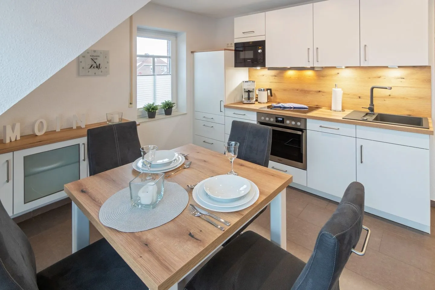 Ihre moderne Küchenzeile mit Backofen / Ceranfeld (inklusive Abzug), Spülmaschine, Kühlschrank mit Gefrierfach und Mikrowelle lassen keine Wünsche offen. Kaffeemaschine, Toaster, Wasserkocher und andere erforderliche Küchengeräte sind selbstverständlich. Geschirr, Gläser, Becher, Besteck und vieles mehr runden Ihre Küche ab. Ihre 4 Sitzgelegenheiten am Küchentisch laden zum gemütlichen Essen ein. Ihr Küchenfenster ist mit Außenrollladen und Plissee sowie einem Fliegengitter ausgestattet.