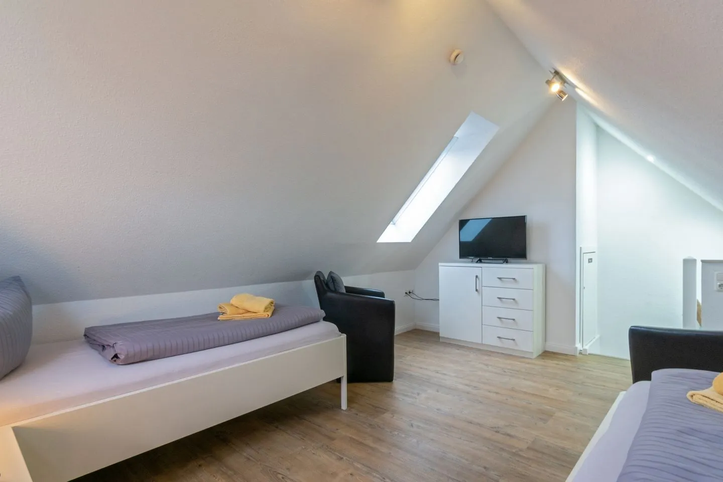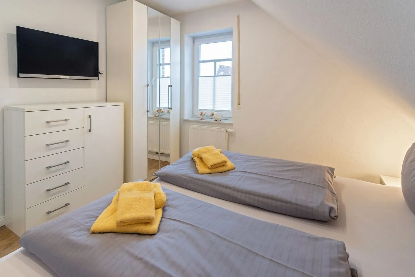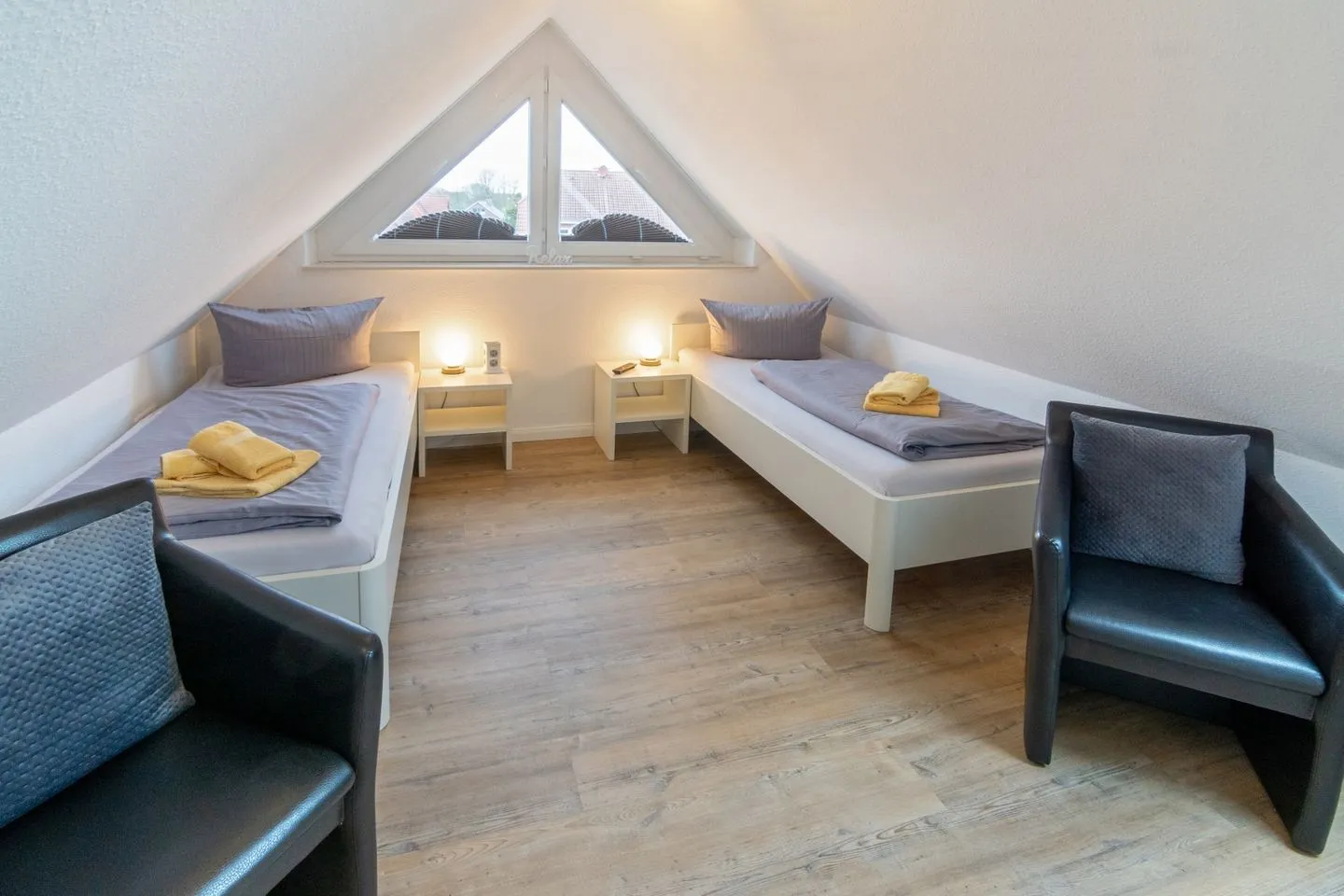Das Schlafzimmer im Dachgeschoss ist mit zwei Einzelbetten (90x200), einer Kommode, zwei gemütlichen Sesseln und einem Flatscreen Sat-TV ausgestattet. Das Schlafzimmerfenster ist mit Plissees ausgestattet.