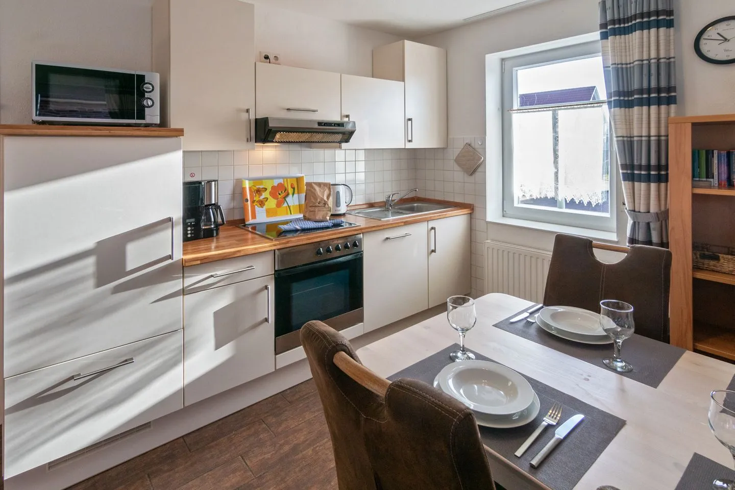 Küche mit Abzugshaube, Backofen, Herd, Kaffeemaschine, Kühlschrank, in allen Wohnungen Geschirrspüler in den Küchenzeilen, Mikrowelle, Mixer, Toaster, mit allen erforderliche Küchengeräten, Geschirr und Gläsern, Bechern etc. Essecke mit Sitzgelegenheiten. Kinderhochstuhl zustellbar.