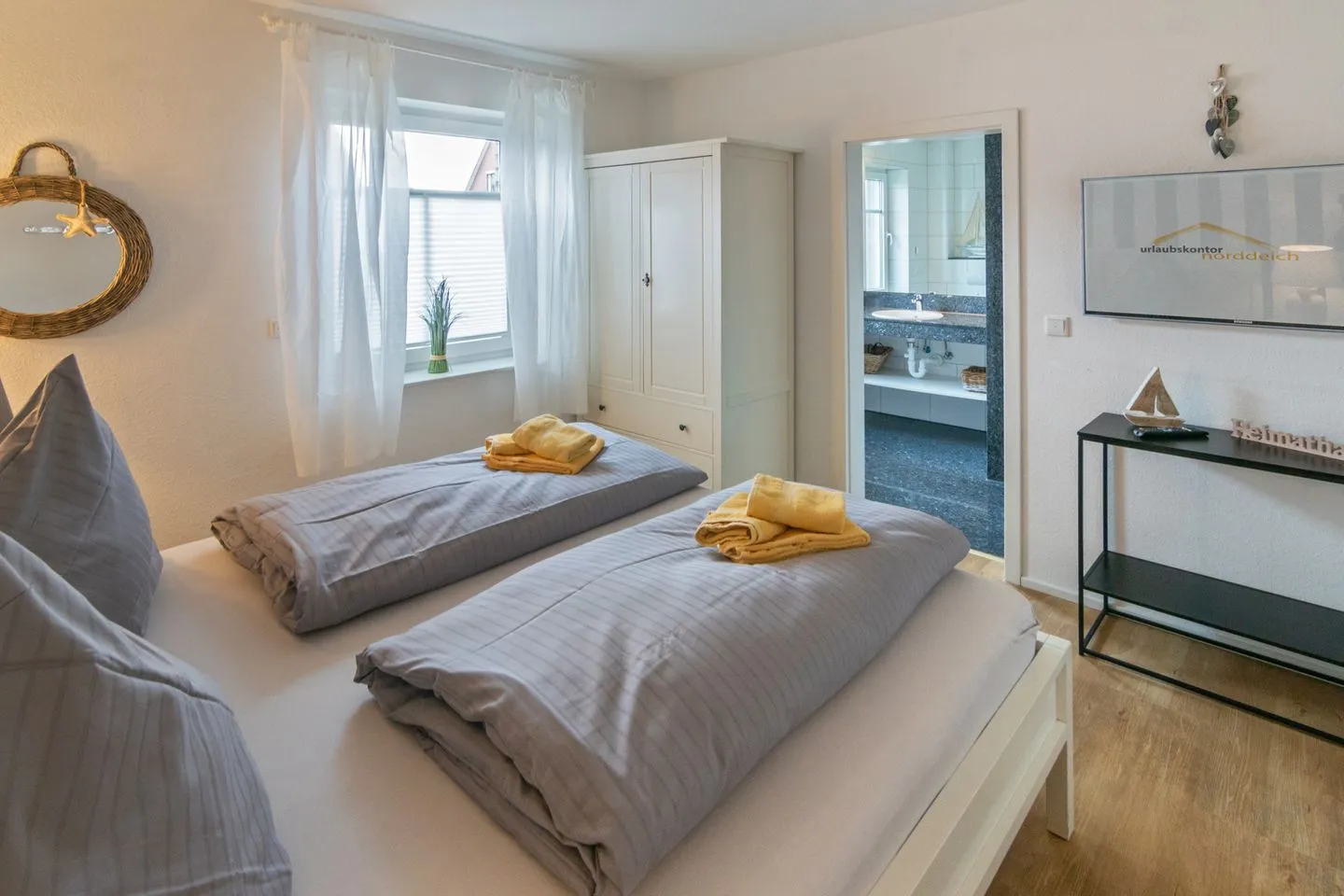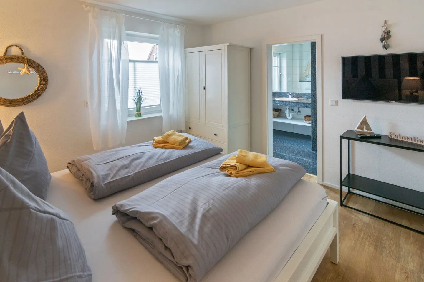 Dieser verfügt über ein gemütliches Bett (180 x 200 cm), 40 Zoll LED-TV, Kleiderschrank mit Holzbügeln, eine Kommode, zwei