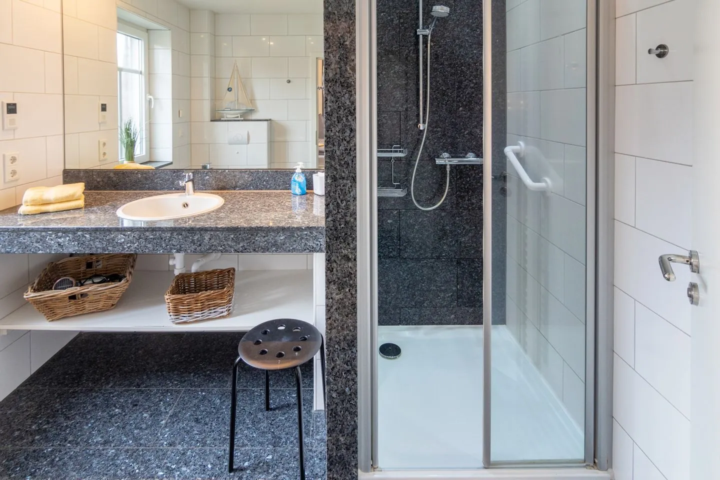 Bodenebene Dusche mit LED-Beleuchtung, Hänge-WC, Waschtischkombination mit Waschbecken in Blue-Pearl-Granitplatte eingesetzt inklusive großem Wandspiegel, Wandeinbauradio, Granitfußboden in Blue-Pearl mit elektronisch steuerbarer Fußbodenheizung bilden ein Wohlfühl-Ambiente. Kosmetikspiegel, Fön und Körperwaage für alle Bedürfnisse sind vorhanden. Ein Handtuchheizkörper und elektrische Fensterrollläden sind ebenfalls vorhanden.