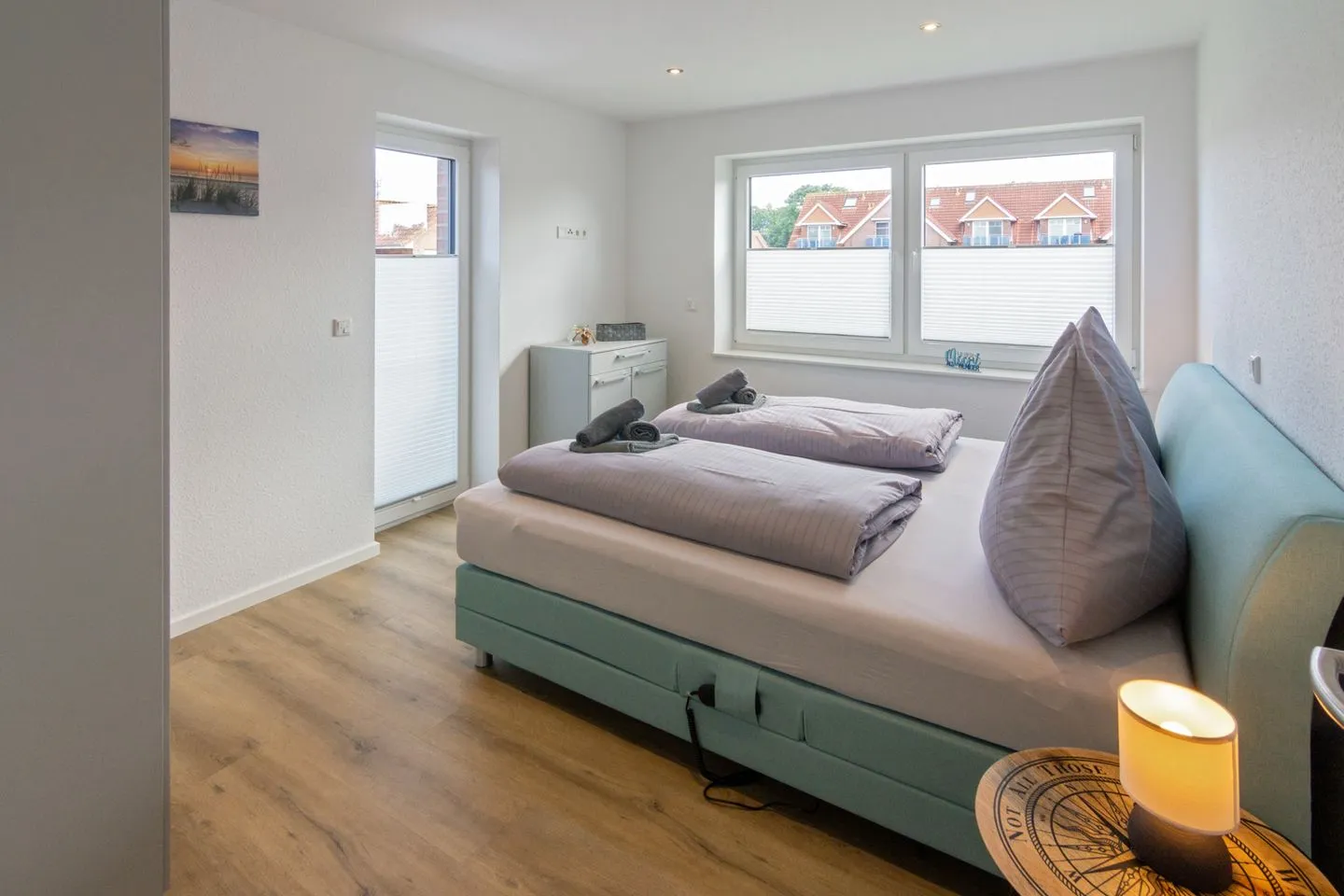 Dieser verfügt über ein gemütliches Boxspring-Bett (180 x 200 cm), Kleiderschrank mit Holzbügeln, zwei Nachttische mit Lampen. Elektronisch steuerbare Fußbodenheizung und elektrische Fensterrollläden. Fliegengitter sind vorhanden.