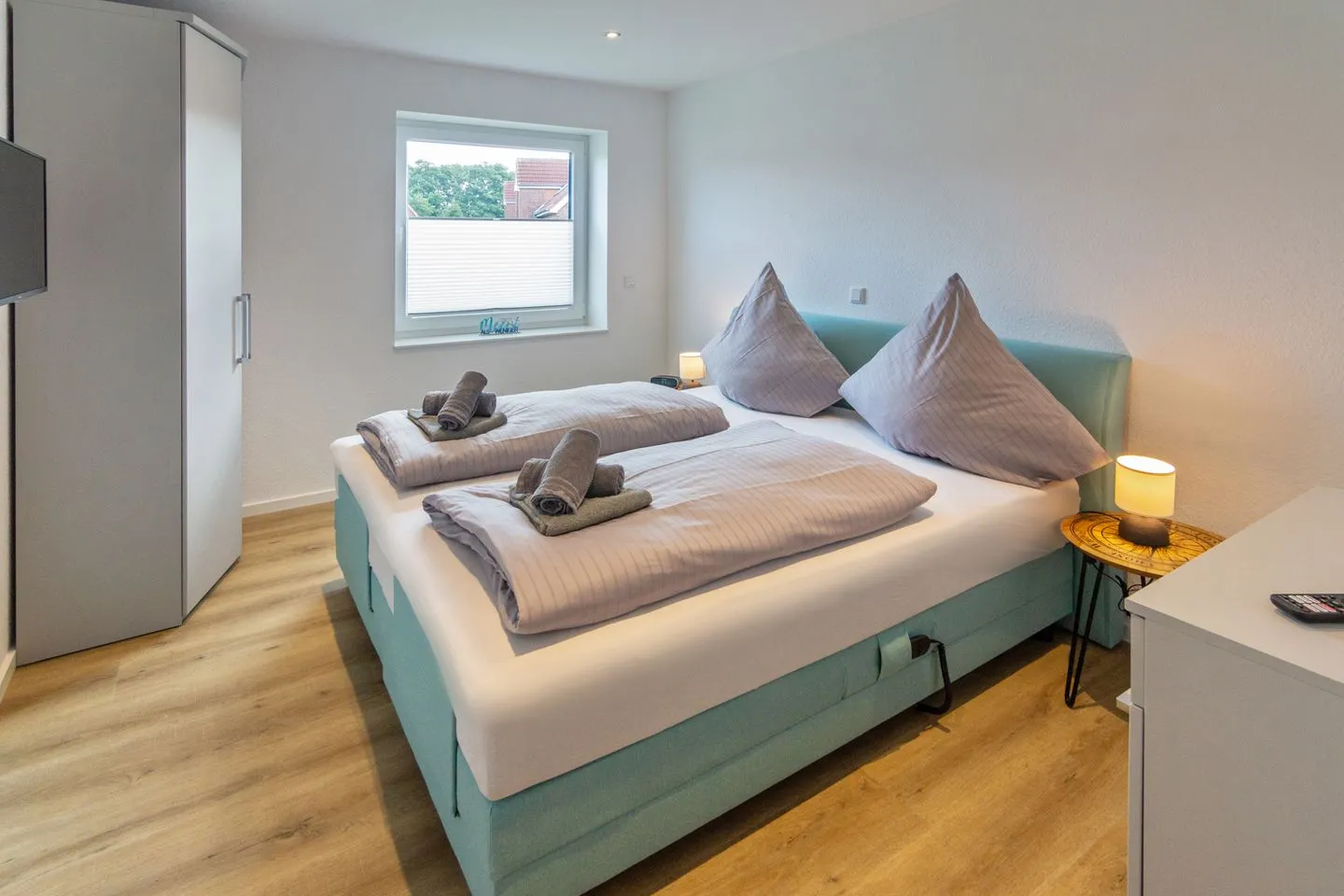 Dieser verfügt über ein gemütliches Boxspring-Bett (180 x 200 cm), FLAT-TV, Kleiderschrank mit Holzbügeln, eine