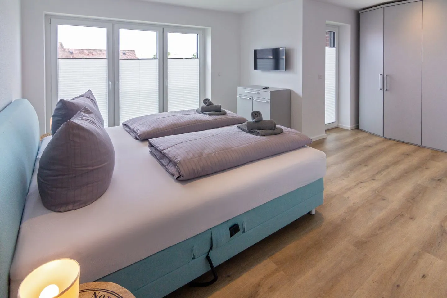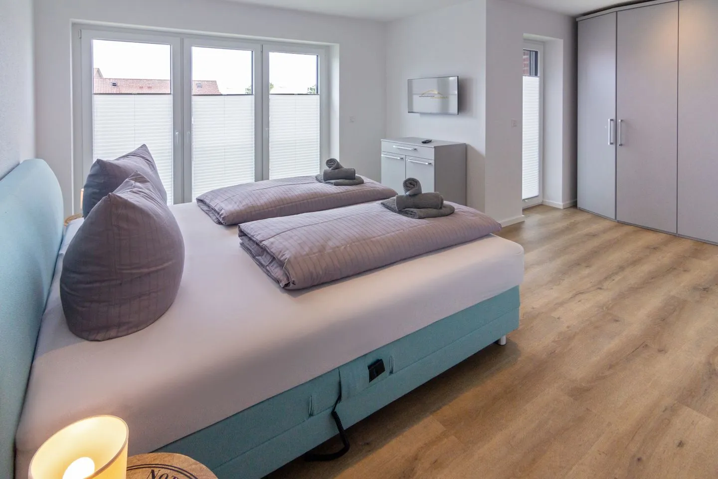 Dieser verfügt über ein gemütliches Boxspring-Bett (180 x 200 cm), Kleiderschrank mit Holzbügeln, zwei Nachttische mit Lampen. Elektronisch steuerbare Fußbodenheizung und elektrische Fensterrollläden. Fliegengitter sind vorhanden.