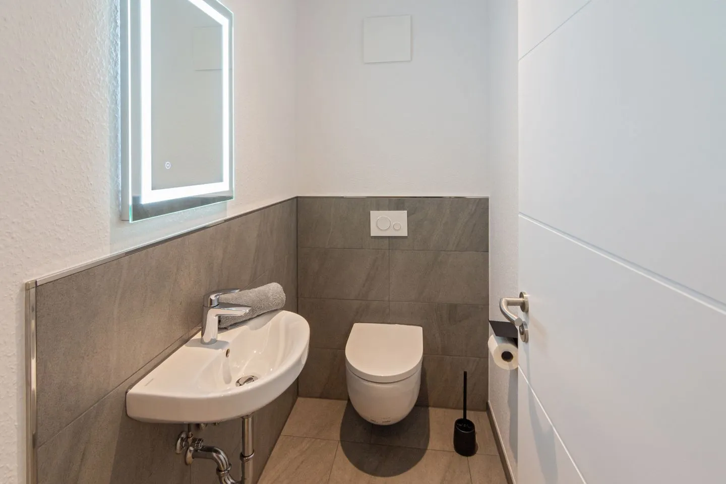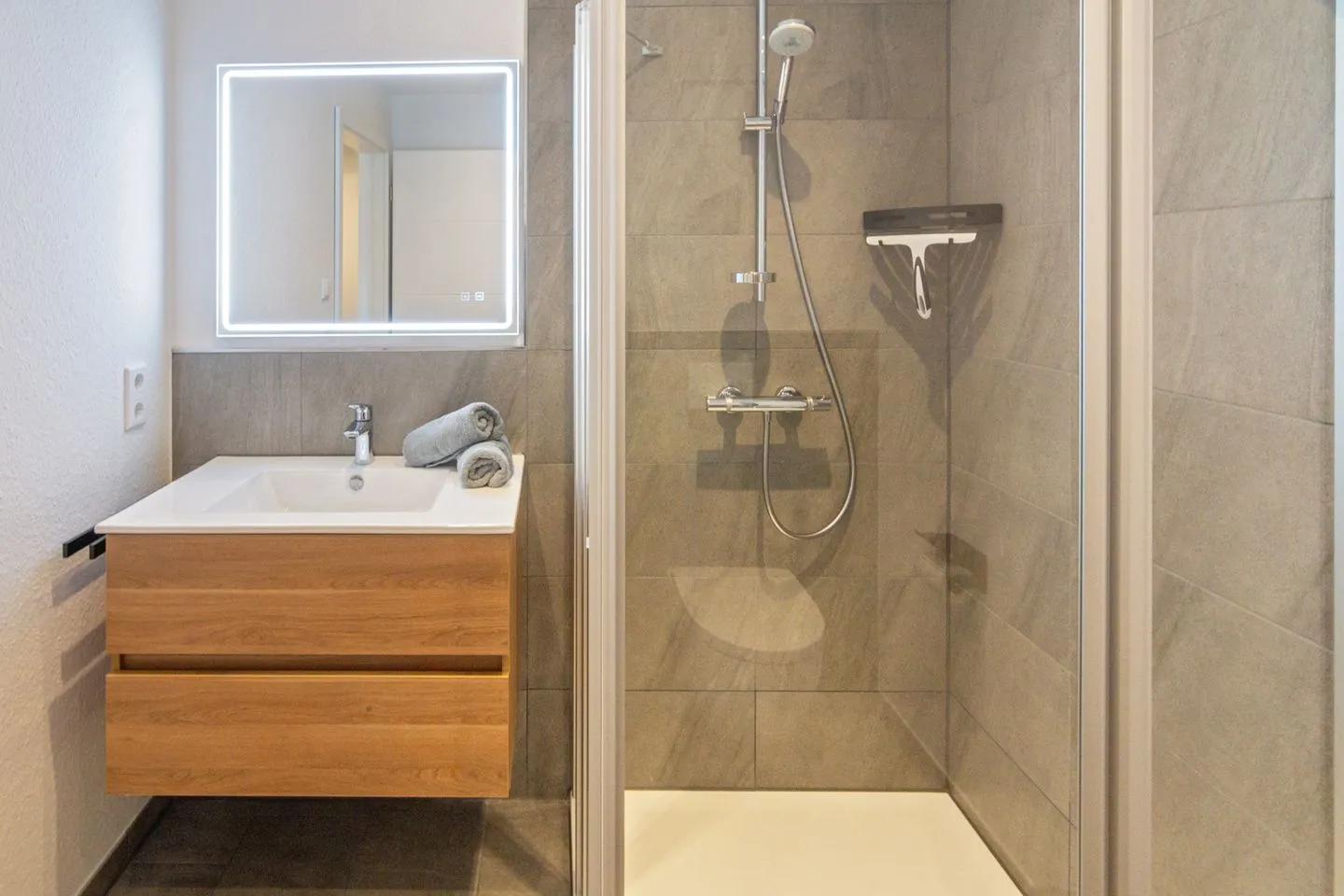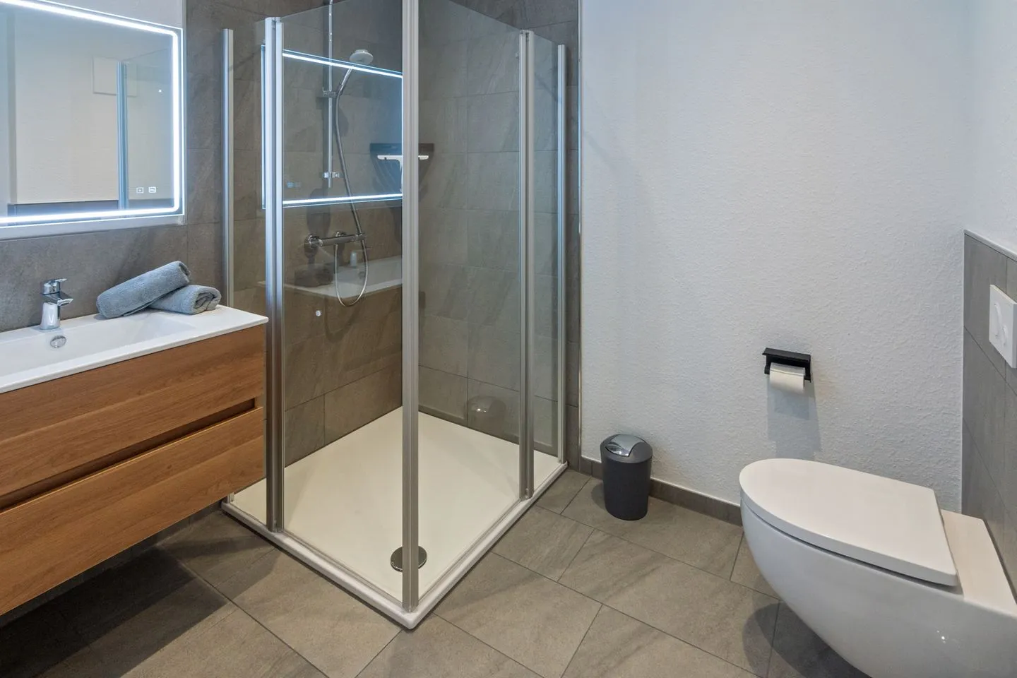 Bodenebene Dusche, Hänge-WC, Waschtischkombination inklusive großem Wandspiegel, elektronisch steuerbarer Fußbodenheizung bilden ein Wohlfühl-Ambiente. Ein Fön sowie ein Handtuchheizkörper sind ebenfalls vorhanden.
