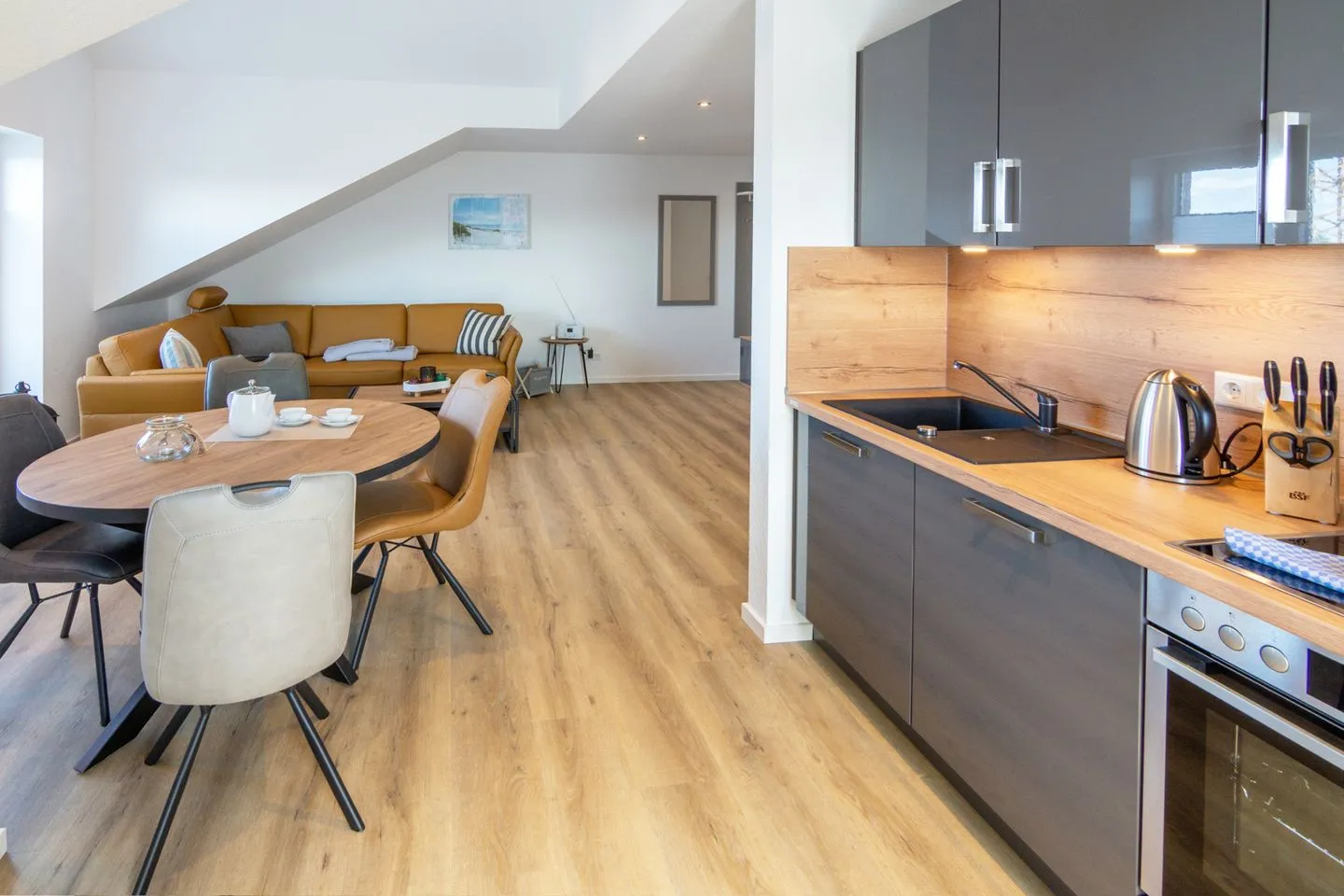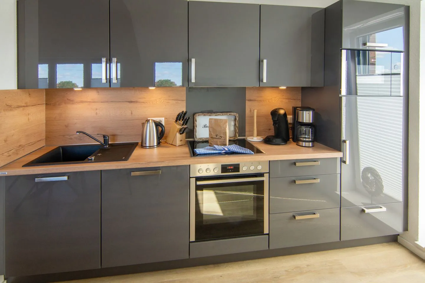 Die Ferienwohnung verfügt über eine großzügige Einbauküche mit Neff-Geräten - 4-Zonen-Cerankochfeld inklusive Dunstabzug, Backofen, Mikrowelle, Kühlschrank mit Gefrierfach, Spülbecken plus Spülmaschine, Kaffeemaschine & Senseo-Padmaschine.