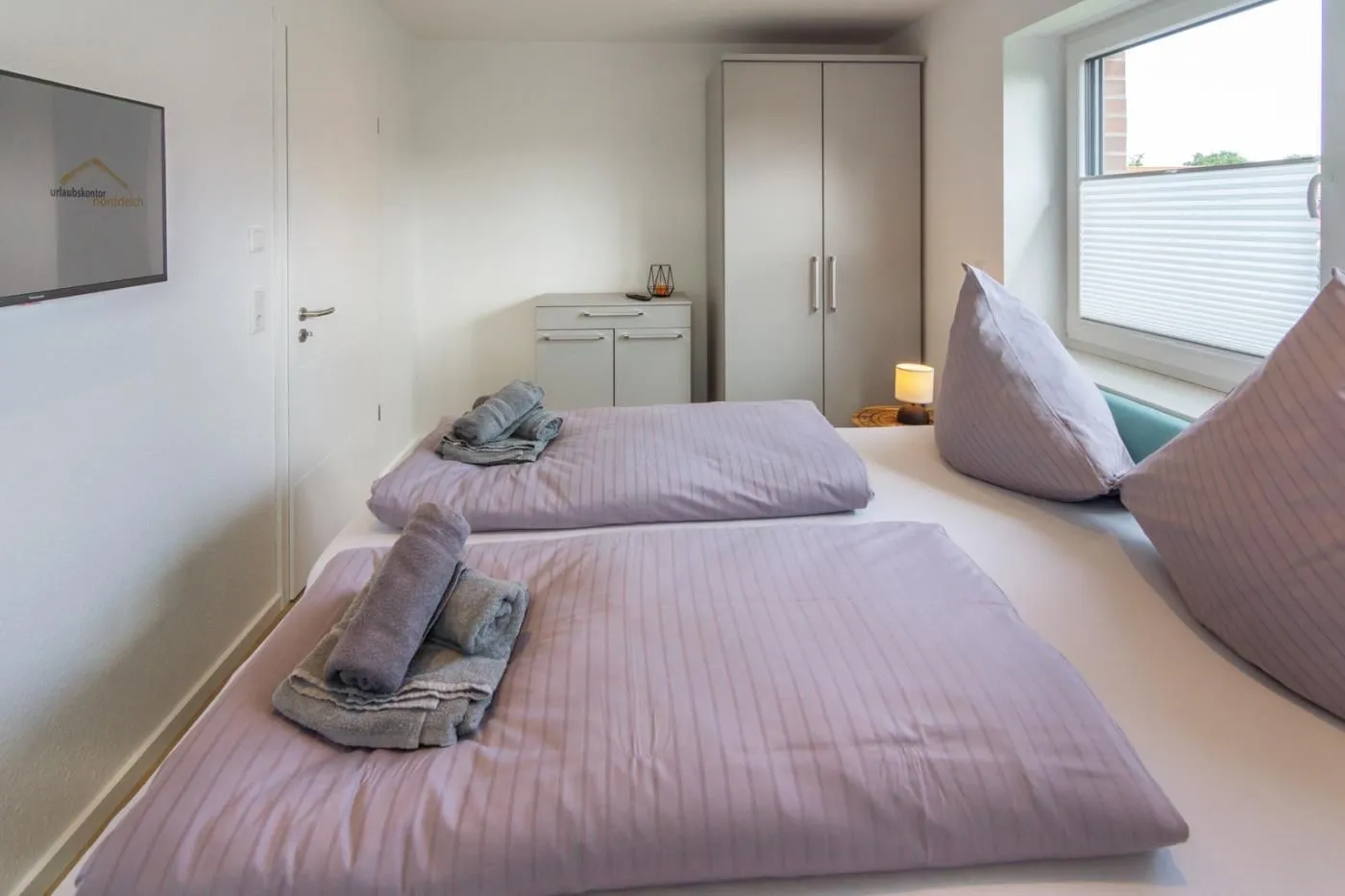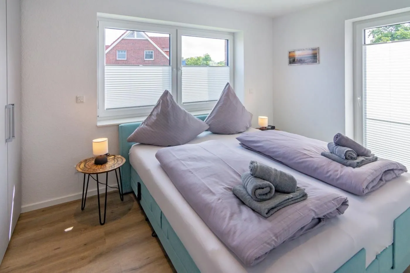 Dieser verfügt über ein gemütliches Boxspring-Bett (180 x 200 cm), FLAT-TV, Kleiderschrank mit Holzbügeln, eine Kommode, zwei Nachttische mit Lampen. Elektronisch steuerbare Fußbodenheizung und elektrische Fensterrollläden.