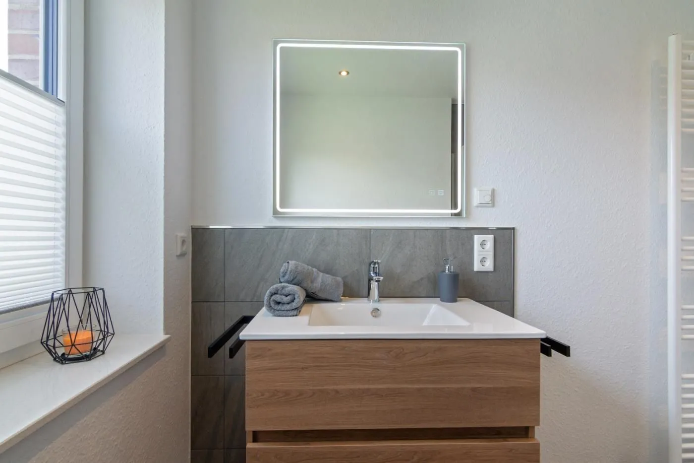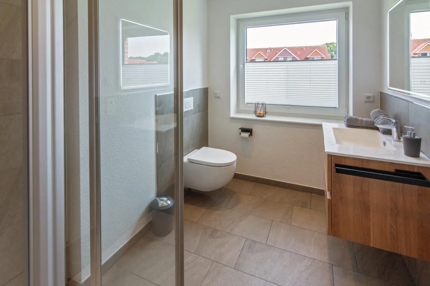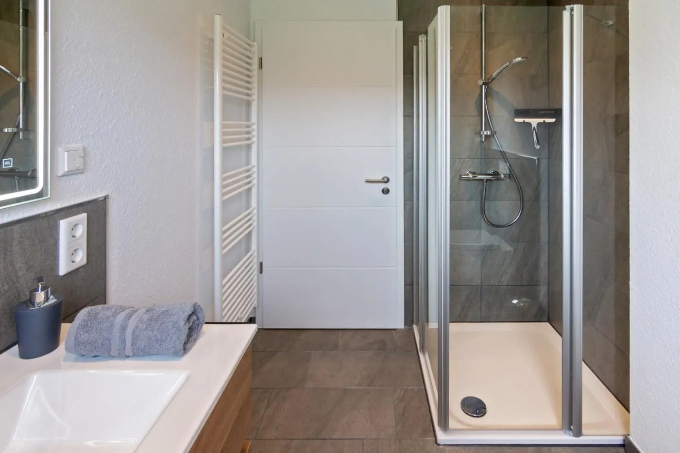 Bodenebene Dusche, Hänge-WC, Waschtischkombination inklusive großem Wandspiegel, elektronisch steuerbarer Fußbodenheizung bilden ein Wohlfühl-Ambiente. Ein Fön sowie ein Handtuchheizkörper sind ebenfalls vorhanden.