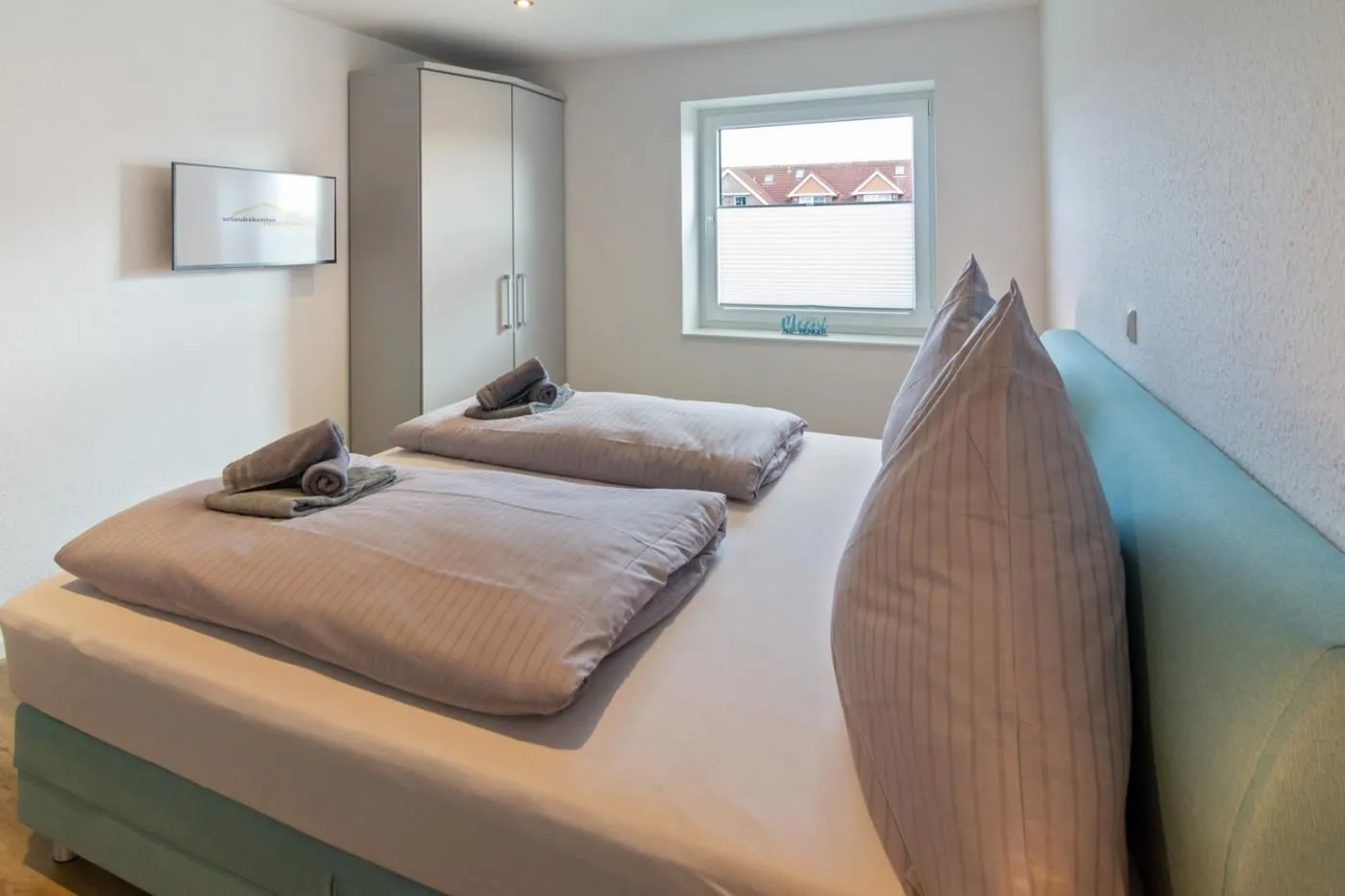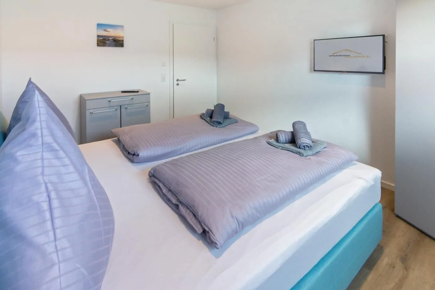 Dieser verfügt über ein gemütliches Boxspring-Bett (180 x 200 cm), FLAT-TV, Kleiderschrank mit Holzbügeln, zwei Nachttische mit Lampen. Elektronisch steuerbare Fußbodenheizung und elektrische Fensterrollläden.