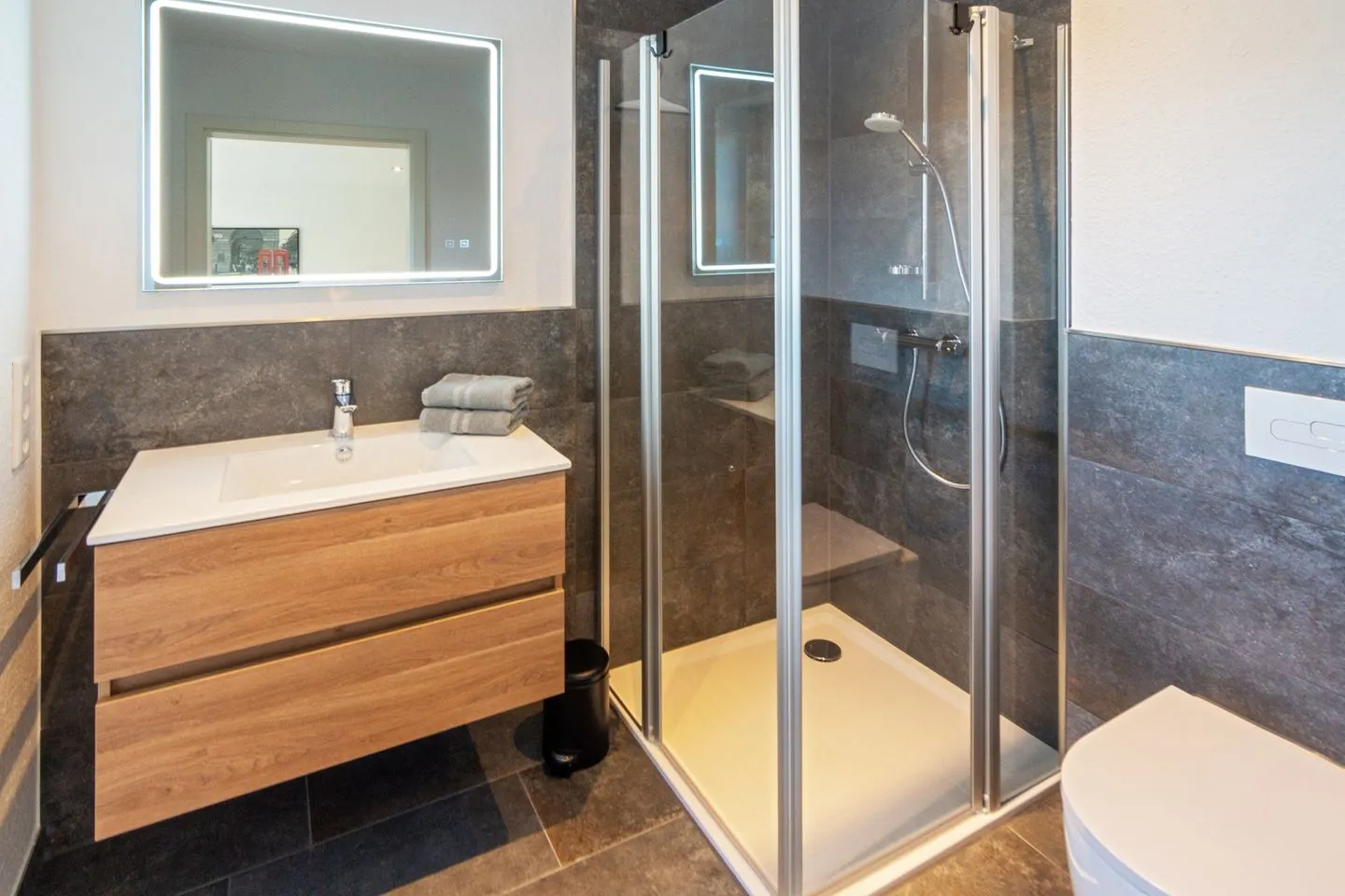 Bodenebene Dusche, Hänge-WC, Waschtischkombination inklusive Wandspiegel, elektronisch steuerbarer Fußbodenheizung bilden ein Wohlfühl-Ambiente. Ein Fön ist ebenfalls vorhanden.