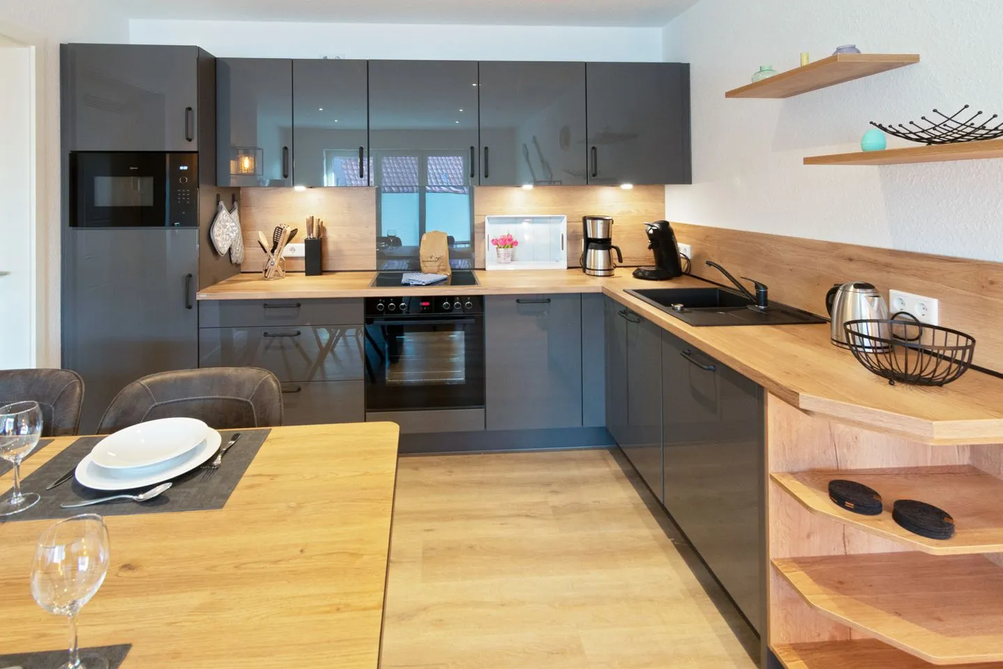 Die Ferienwohnung verfügt über eine großzügige Einbauküche mit 4-Zonen-Induktionskochfeld inklusive Dunstabzug, Backofen, Mikrowelle, Kühlschrank mit Gefrierfach, Spülbecken plus Spülmaschine, Kaffeemaschine & Senseo-Padmaschine.