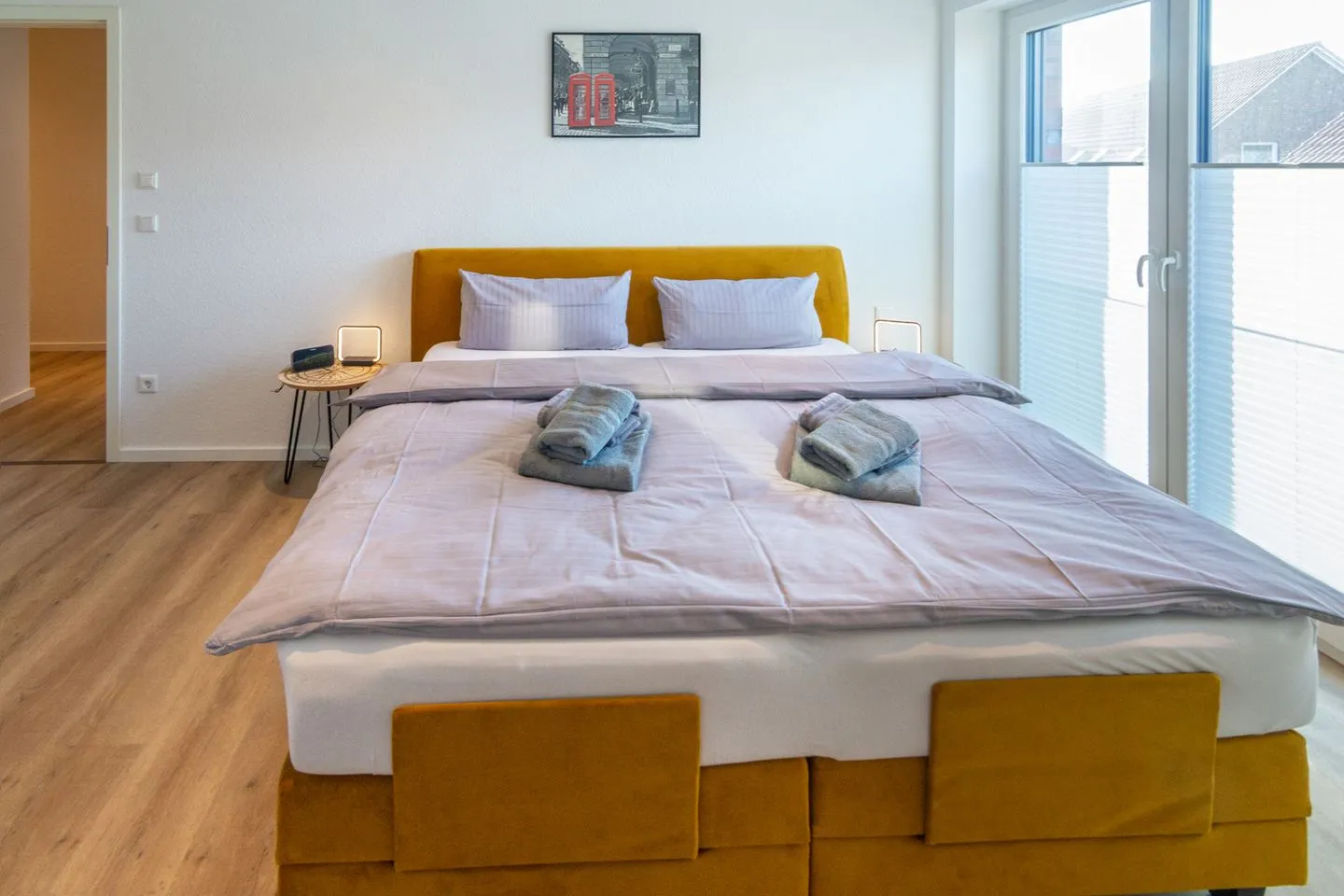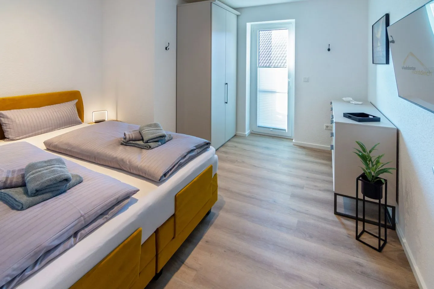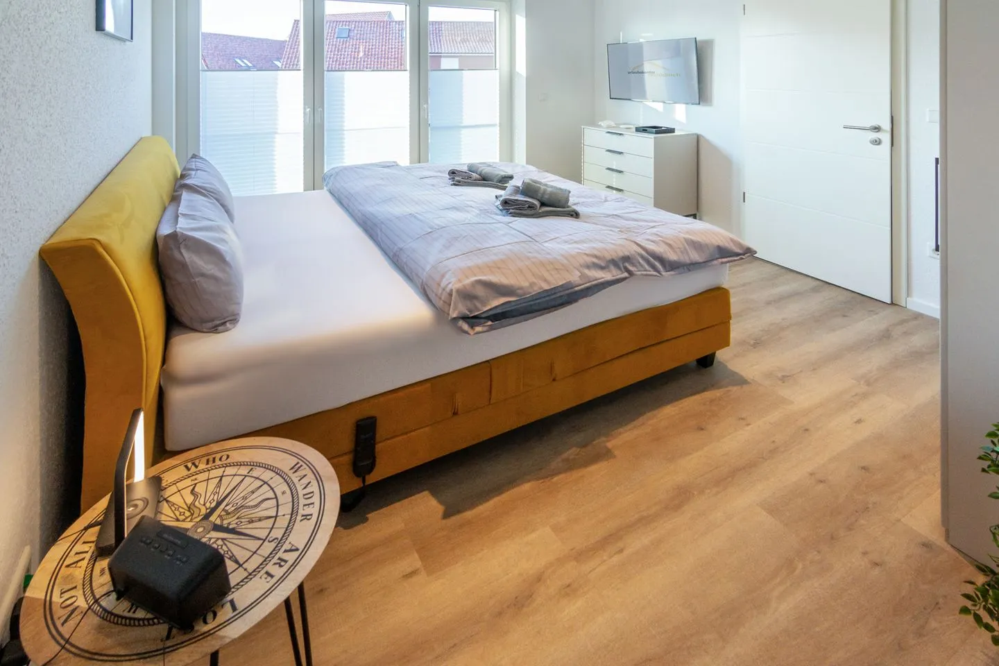 Dieser verfügt über ein gemütliches Boxspring-Bett (180 x 200 cm), FLAT-TV, Kleiderschrank mit Holzbügeln, eine Kommode, zwei Nachttische mit Lampen. Elektronisch steuerbare Fußbodenheizung und elektrische Fensterrollläden.