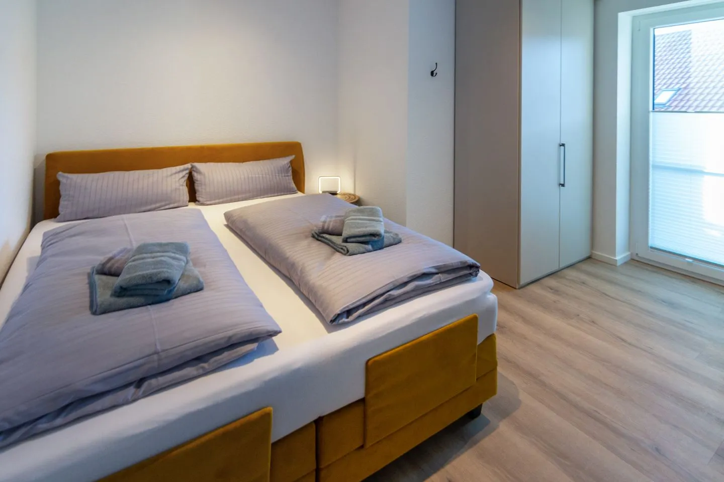 Dieser verfügt über ein gemütliches Boxspring-Bett (160 x 200 cm), FLAT-TV, Kleiderschrank mit Holzbügeln, einen Nachttisch mit Lampe. Elektronisch steuerbare Fußbodenheizung und elektrische Fensterrollläden.