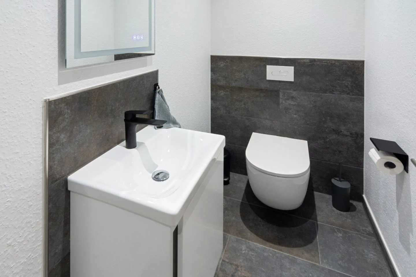 Hänge-WC, Waschtischkombination inklusive Wandspiegel, elektronisch steuerbarer Fußbodenheizung.