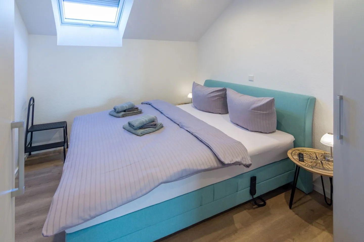 Dieser verfügt über ein gemütliches Boxspring-Bett (160 x 200 cm), FLAT-TV, Kleiderschrank mit Holzbügeln, zwei Nachttische mit Lampen. Elektronisch steuerbare Fußbodenheizung und elektrische Fensterrollläden.