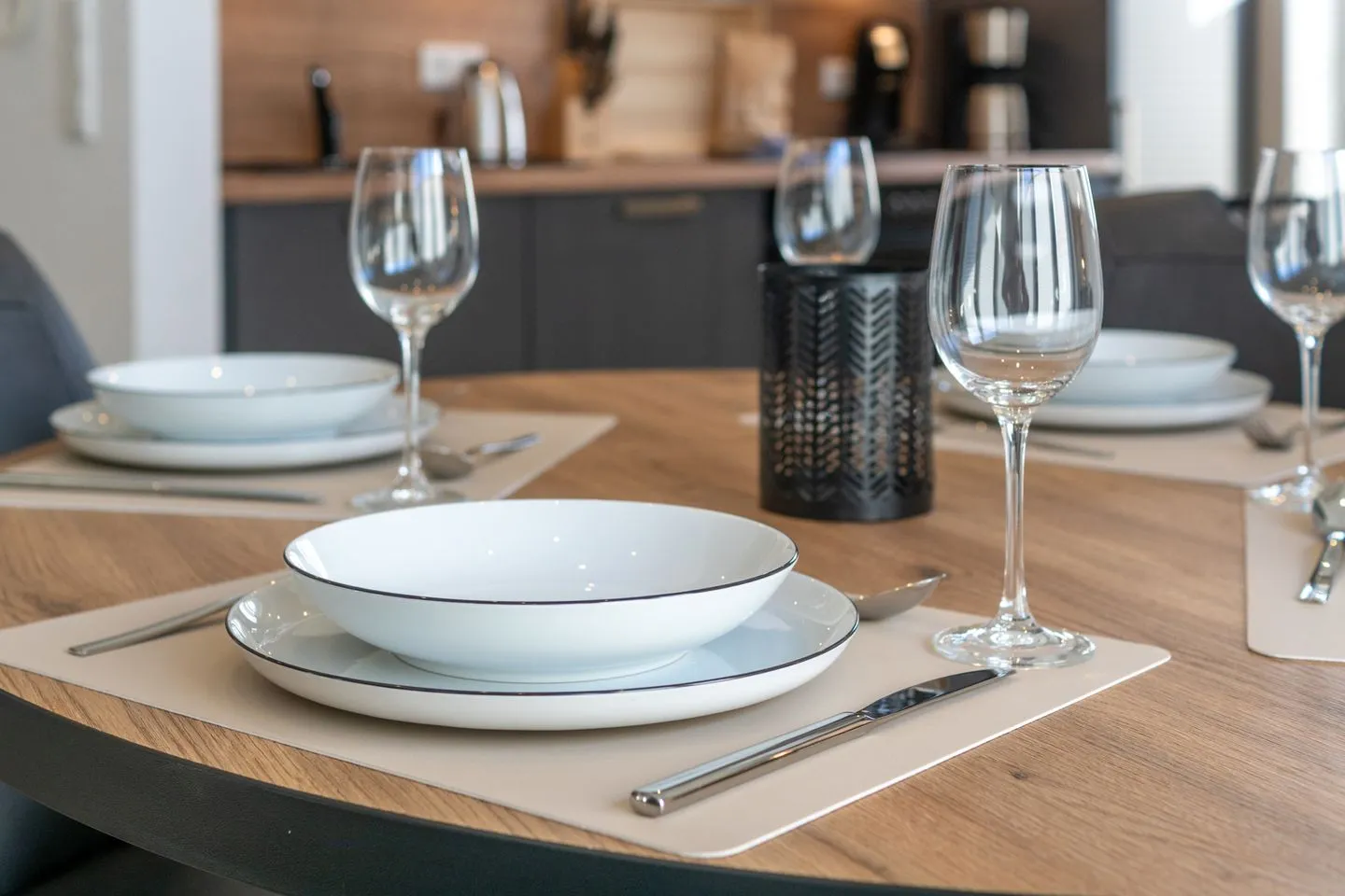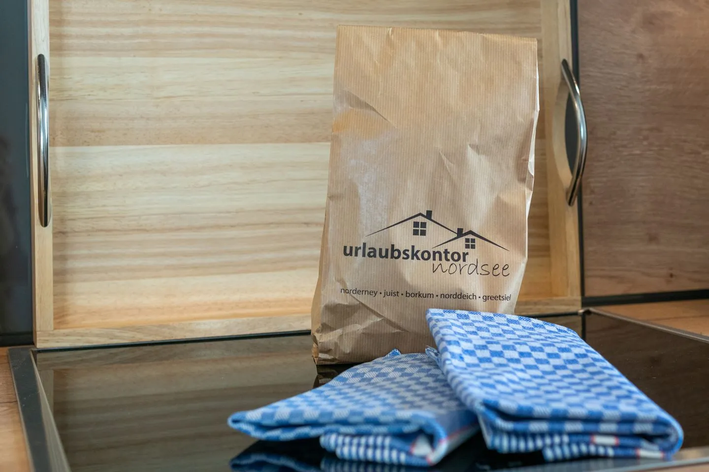 Im offenen Wohnbereich integriert ist eine voll ausgestattete Küche, die mit Induktionsherd, Backofen, Mikrowelle, Kühlschrank mit Gefrierfach, Geschirrspüler, Mixer, Kaffeemaschine, Toaster und weiteren Küchenutensilien keine Wünsche offenlässt. Gemeinsam Speisen ist im separaten Essbereich am großen Esstisch möglich. Ein eigener Balkon mit passenden Gartenmöbeln sowie ein zusätzlicher Gartenbereich und ein Strandkorb laden zum Entspannen im Freien ein.
