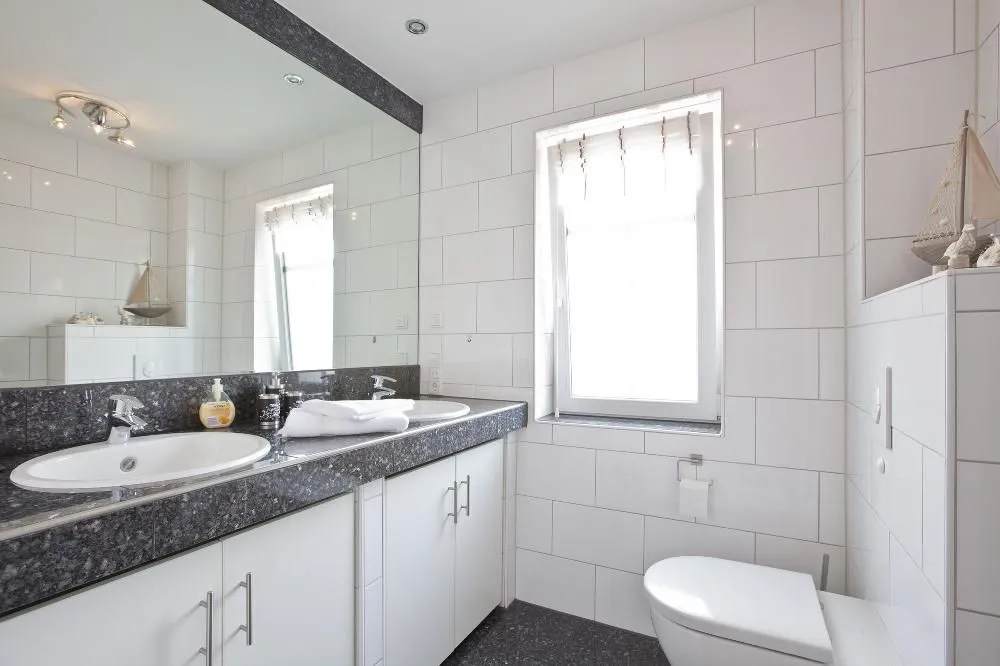 Das Bad ist mit einer großen Wellnessdusche (100x100cm) mit LED-Beleuchtung ausgestattet. Zur Ausstattung gehören weiterhin zwei Waschbecken. Ein Fön, Kosmetikspiegel, eine Waage sowie ein Handtuchwärmer sind selbstverständlich.