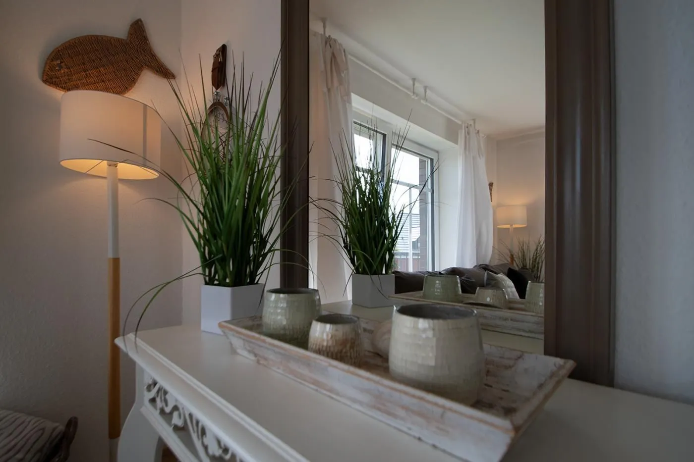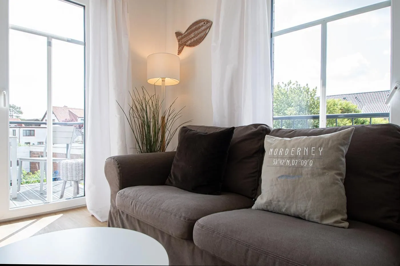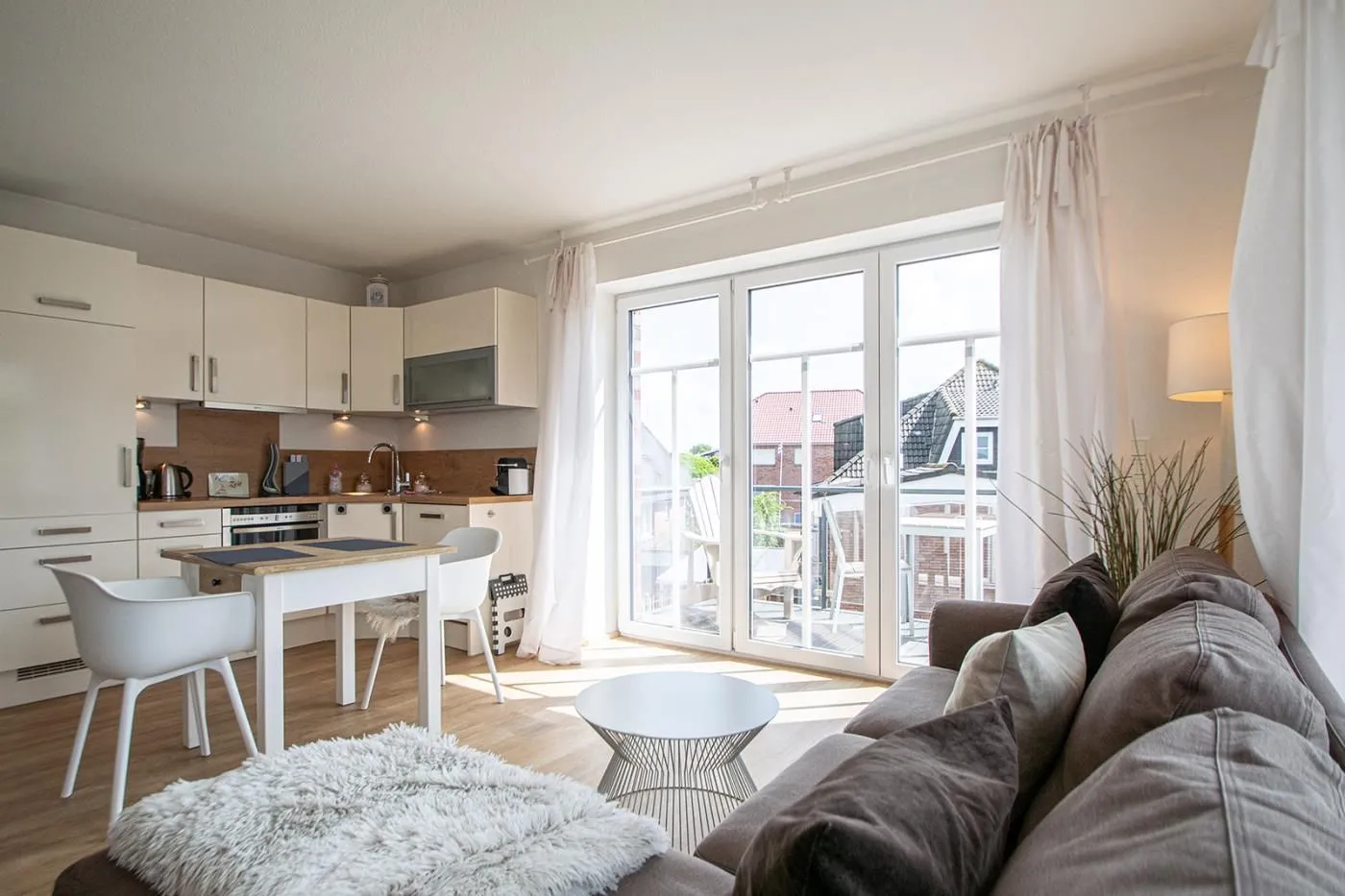 Ein großzügiger Wohnbereich mit maritimen Flair und offener Küche erwartet Sie in dieser exklusiven Ferienwohnung auf Norderney. Ein Ort zum Entspannen. Hier finden Sie eine gemütliche Couch sowie einen schwenkbaren 48" LED Flachbildfernseher. Für gesellige Abende sind einige Gesellschaftsspiele wie Monopoly, Schach, Dame vorhanden. Telefon in das deutsche Festnetz ist für Sie inklusive. Vom Wohnbereich aus erreichen Sie den möblierten Balkon.