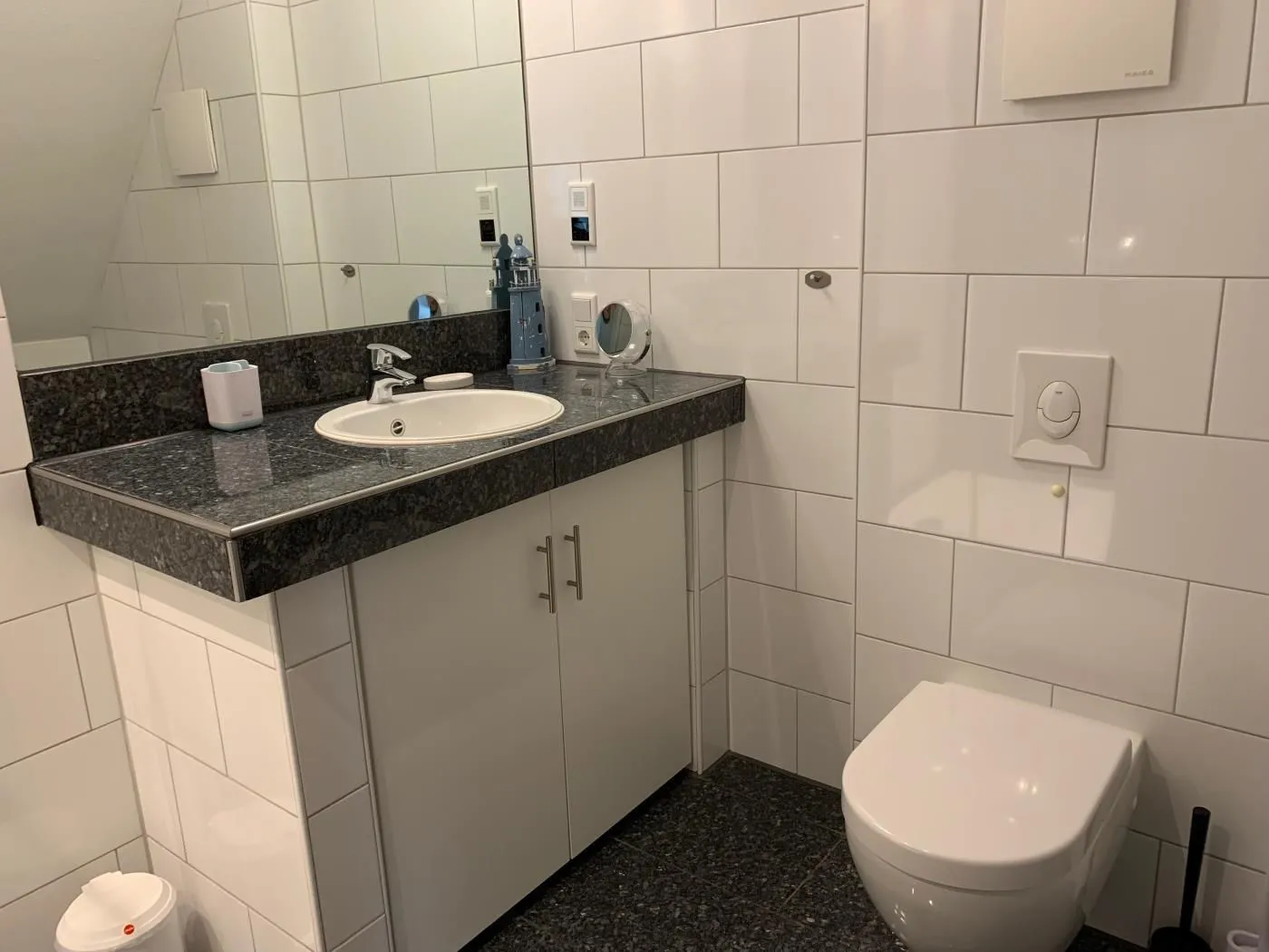 Das Bad ist mit einer großen Wellnessdusche (100x100cm) mit LED-Beleuchtung ausgestattet. Zur Ausstattung gehören ein Fön, Kosmetikspiegel, eine Waage sowie ein Handtuchwärmer.
