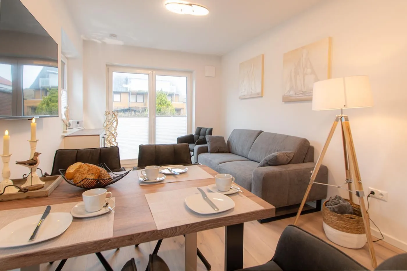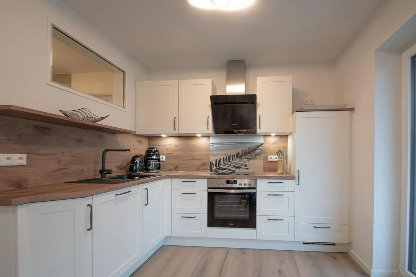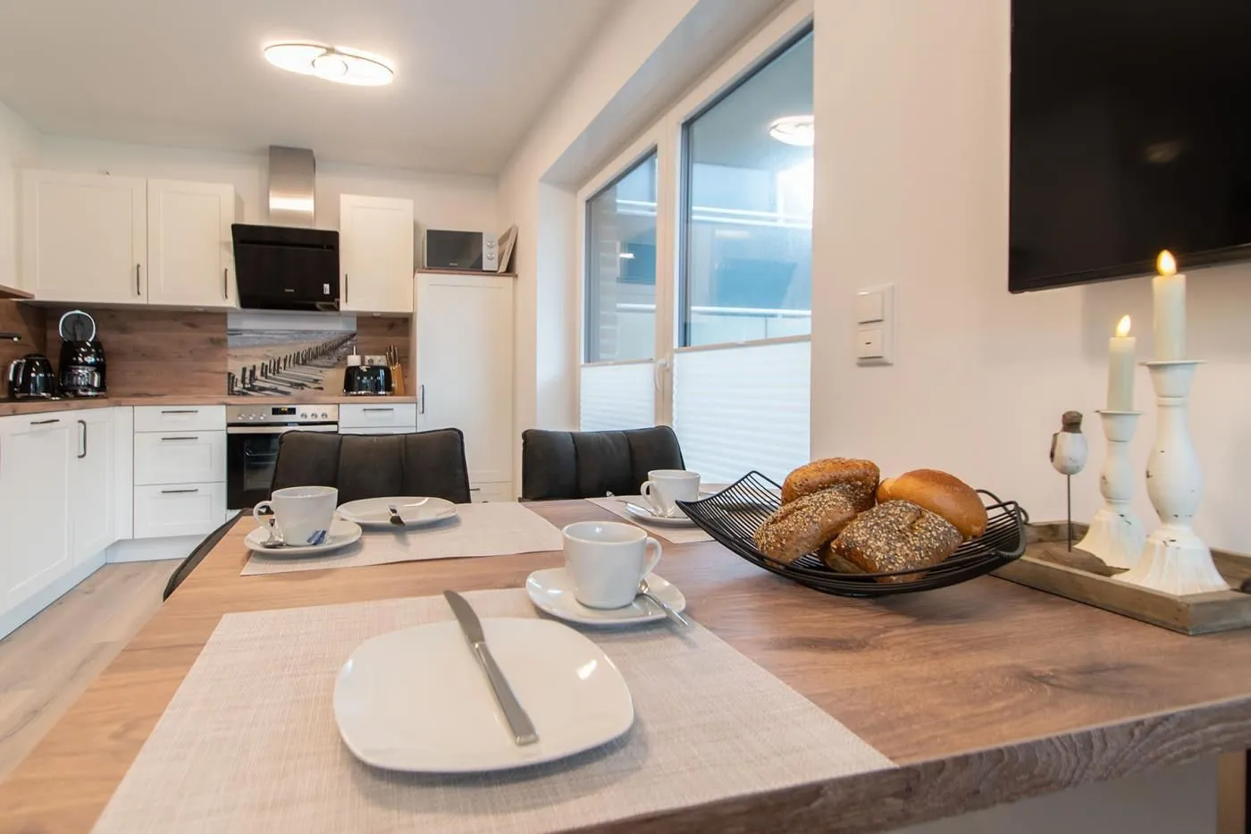 Über den breiten Flur gelangen Sie in den offenen Küchenbereich, welcher an den hellen und gemütlichen Wohnbereich angrenzt. Hier finden Sie eine hochwertige und bequeme Loungegarnitur, einen Smart-TV und einen Essbereich für 4 Personen.