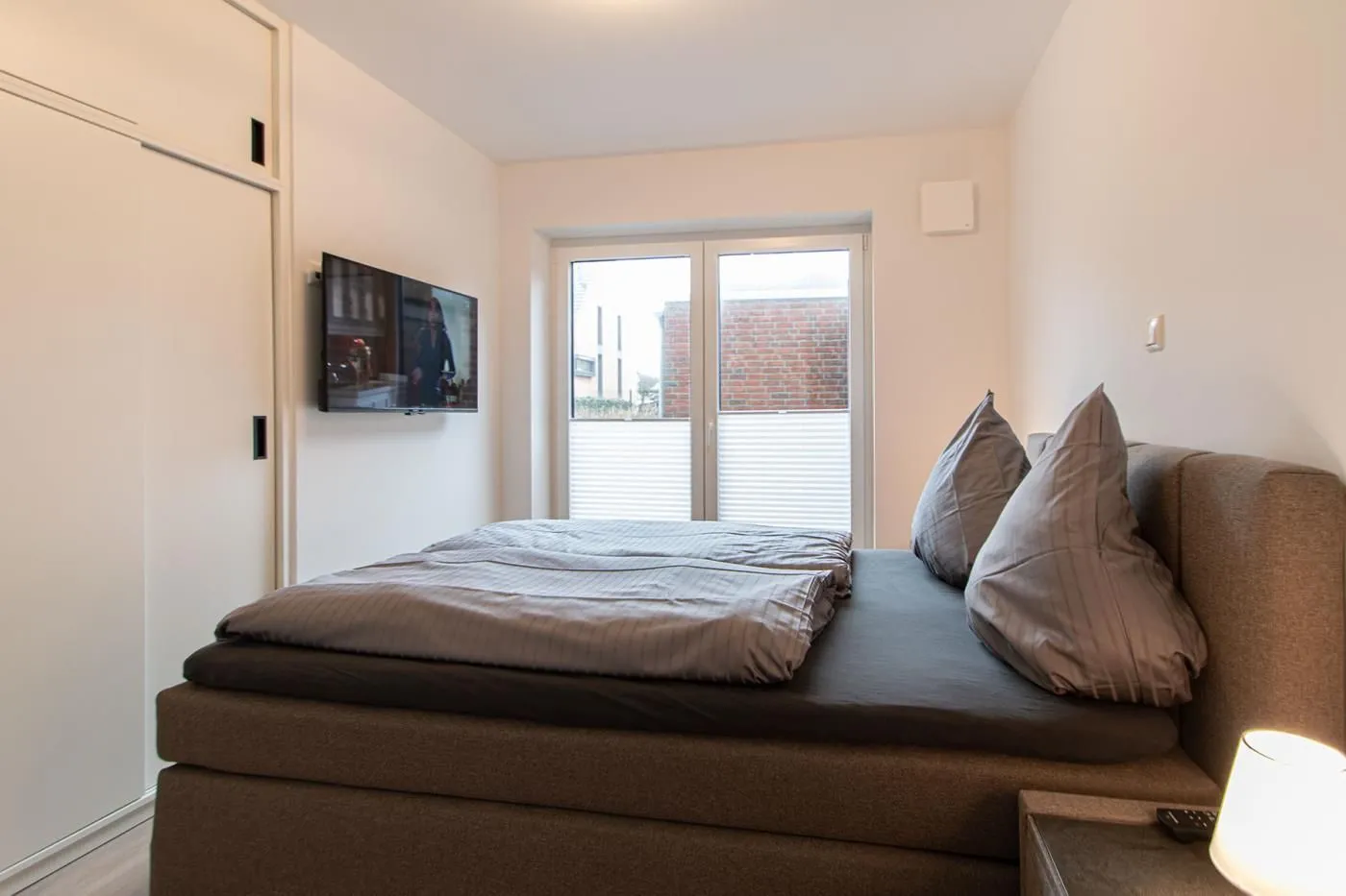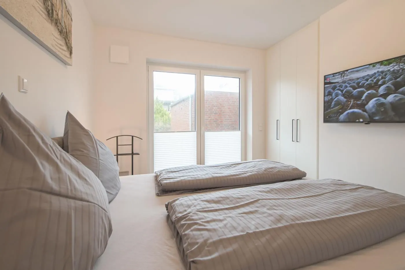 Ihre Ferienwohnung verfügt über zwei separate Schlafzimmer mit Boxspringbetten, TV, Kleiderschrank und Nachttischen. Ein Schlafzimmer mit 180cm x 200cm Bett und ein Schlafzimmer mit 140 cm x 200 cm Bett.