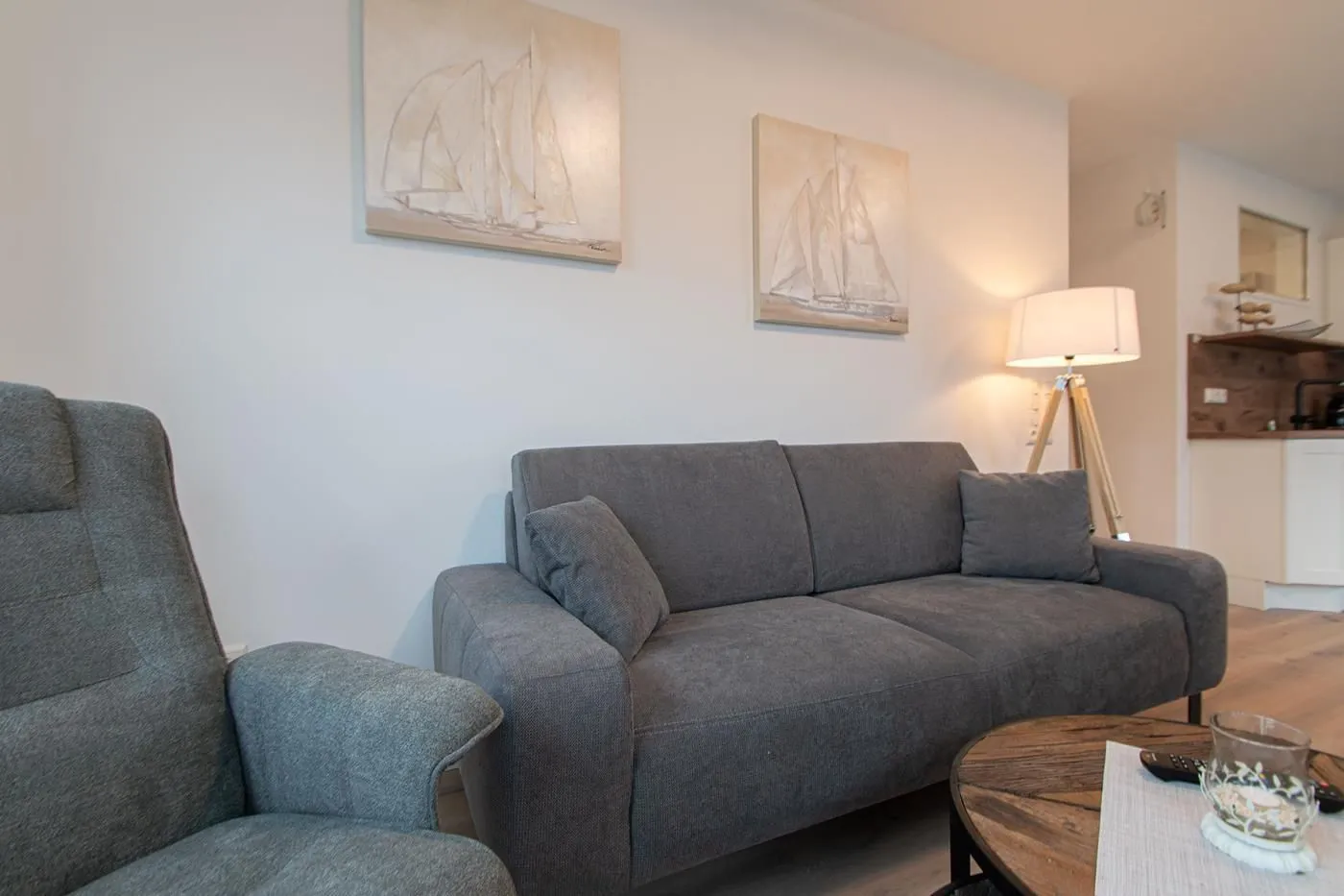 Über den breiten Flur gelangen Sie in den offenen Küchenbereich, welcher an den hellen und gemütlichen Wohnbereich angrenzt. Hier finden Sie eine hochwertige und bequeme Loungegarnitur, einen Smart-TV und einen gemütlichen Relaxsessel.