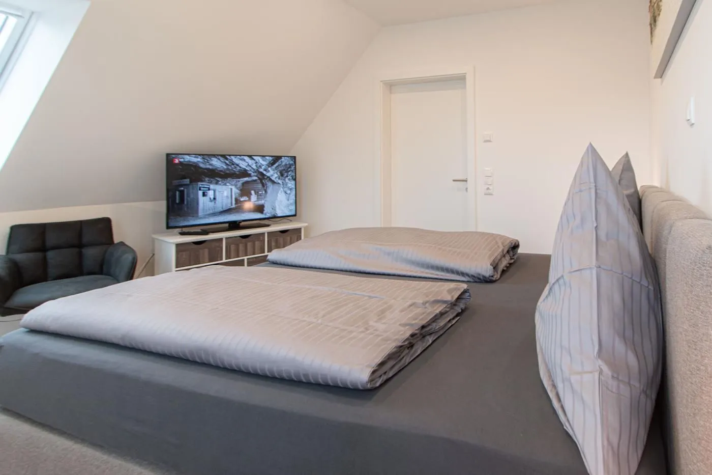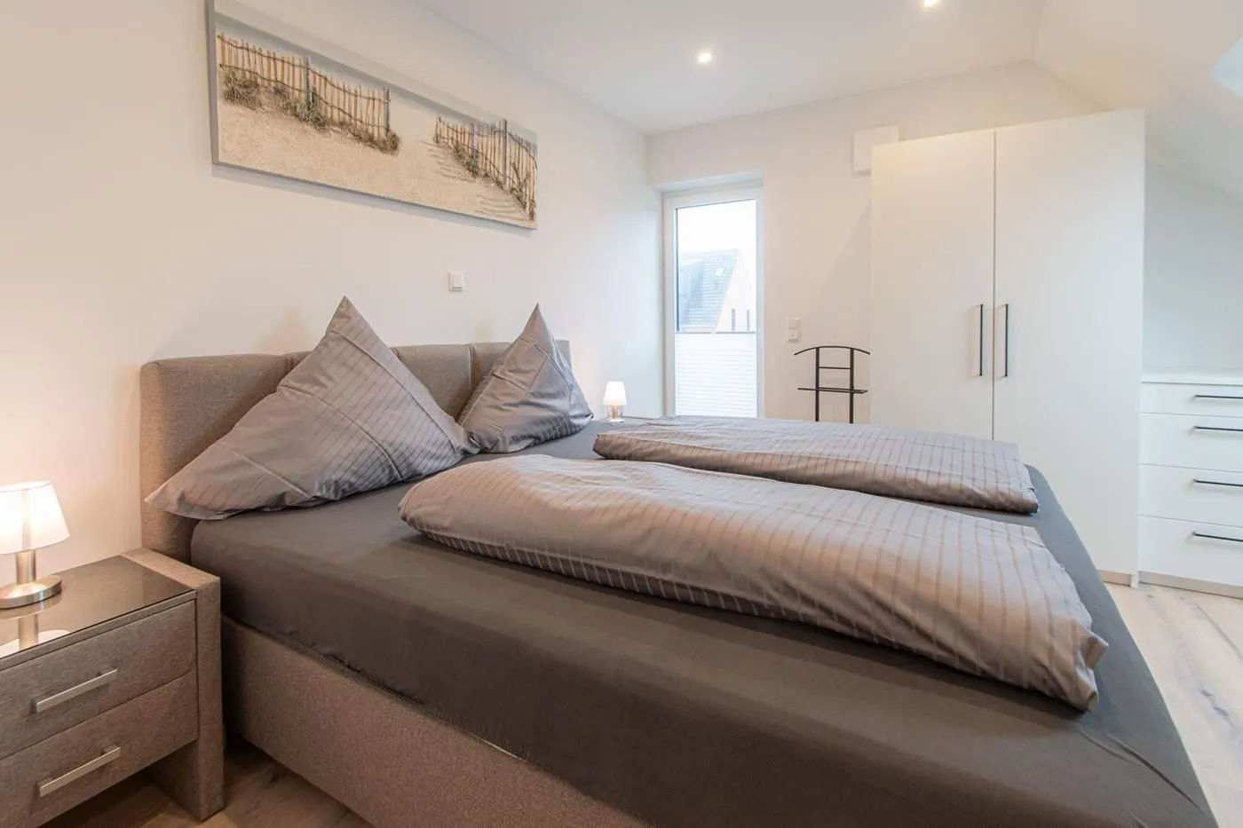 Ihre Ferienwohnung verfügt über zwei separate Schlafzimmer mit großen Boxspringbetten (180 x 200 cm sowie 160 x 200 cm), TV, Kleiderschrank und Nachttischen.