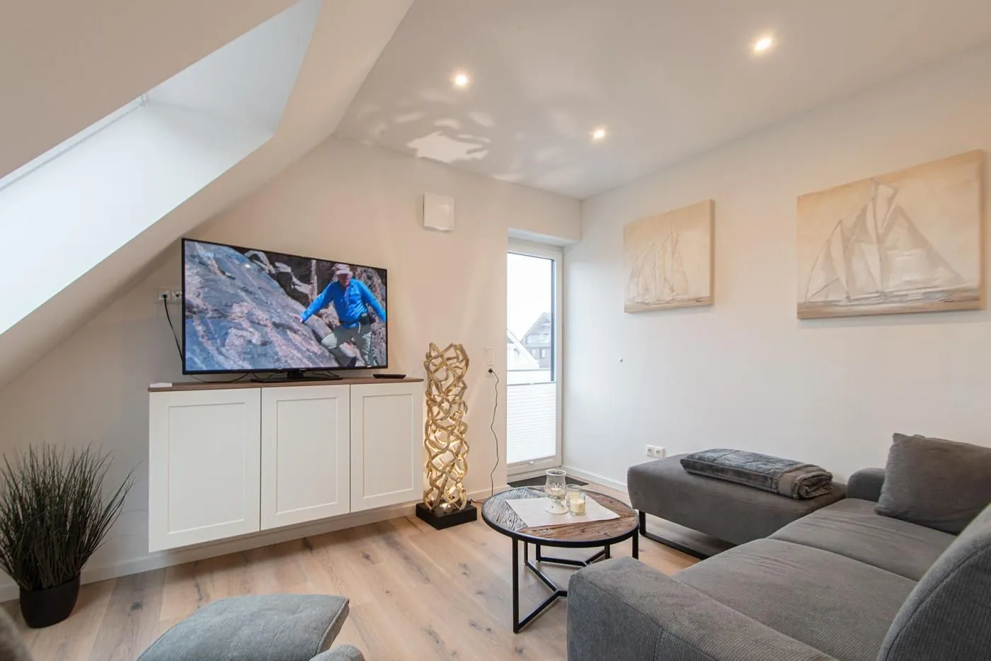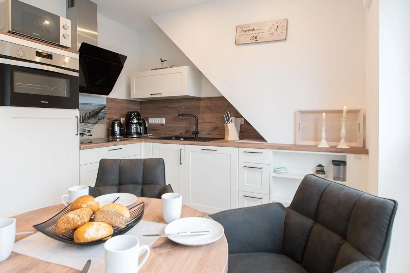 Über den breiten Flur gelangen Sie in den offenen Küchenbereich, welcher an den hellen und gemütlichen Wohnbereich angrenzt. Hier finden Sie eine hochwertige und bequeme Loungegarnitur mit Relaxsessel, einen Smart-TV und einen Essbereich für 4 Personen.