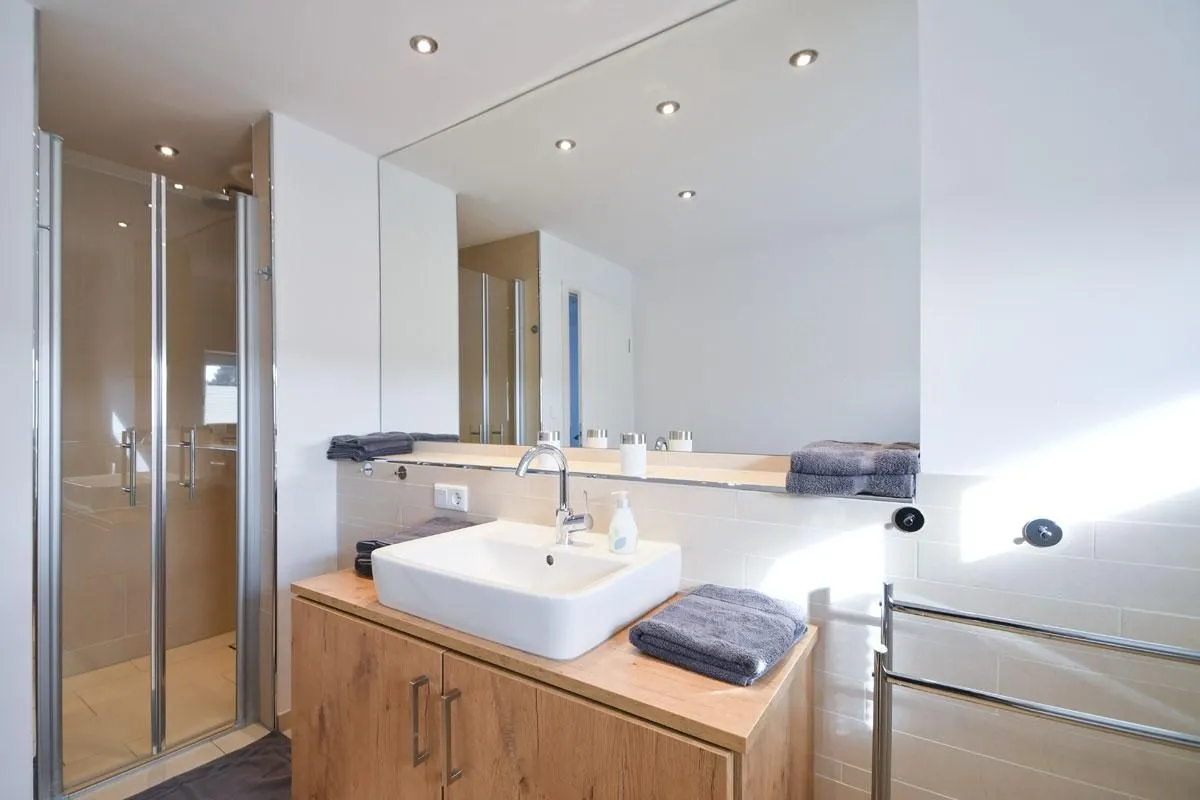 Alle Fenster verfügen über farblich abgestimmte Faltstores. Die gesamte Ferienwohnung ist mit einer Fußbodenheizung ausgestattet, die in jedem Raum separat einstellbar ist.