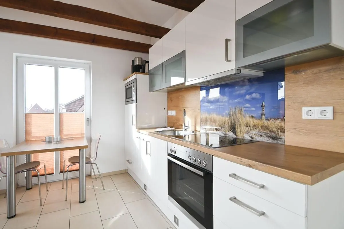 Neben einem Essbereich verfügt die Ferienwohnung über eine moderne und hochwertig ausgestattete Wohnküche mit Backofen, Ceranfeldherd, Geschirrspüler, Mikrowelle, Toaster, Wasserkocher, Kaffee- und Pad-Maschine sowie Kühlschrank mit Gefrierfach.