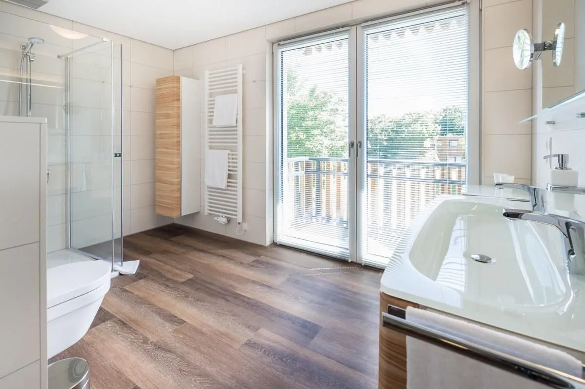 Das großzügig geschnittene Badezimmer ist mit einer bodentief verglasten Dusche, Doppelwaschbecken, Fön, Kosmetikspiegel und einem Handtuchtrockner ausgestattet. Auf Wunsch kann das Badezimmer durch altersgerechte Hilfsmittel (z.B. einem Sitz für die Dusche) ergänzt werden.