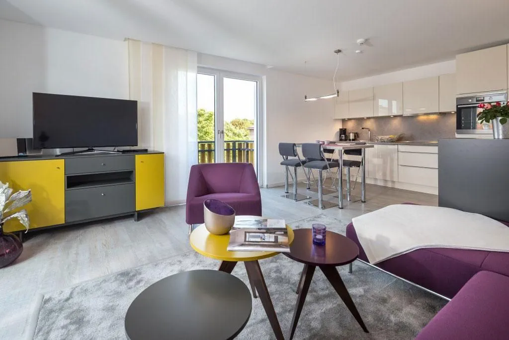 Im Wohnbereich finden Sie eine gemütliche Sofaecke mit Sessel, höhenverstellbaren Wohnzimmertisch, einen 46 Zoll