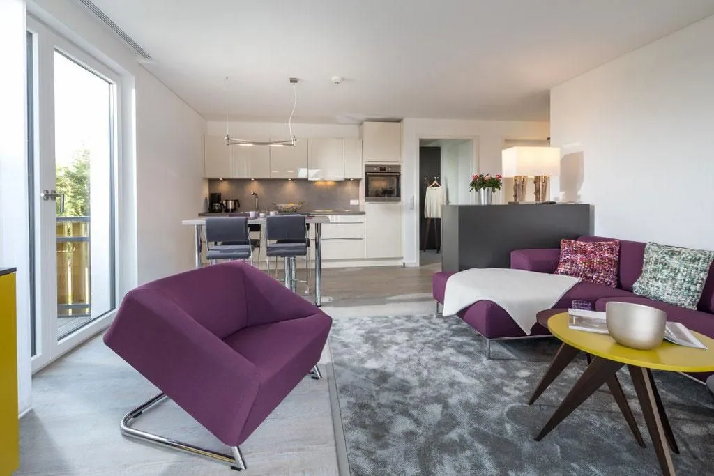 Fenster und Balkone (Ausrichtung Norden und Osten) zu jedem Raum runden die lichtdurchfluteten Räume ab. Die Fußbodenheizung in