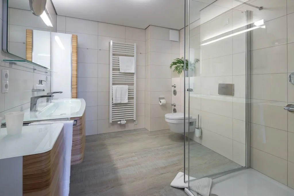 Handtuchtrockner ausgestattet. Auf Wunsch kann das Badezimmer durch altersgerechte Hilfsmittel (z.B. einem Sitz für die Dusche)