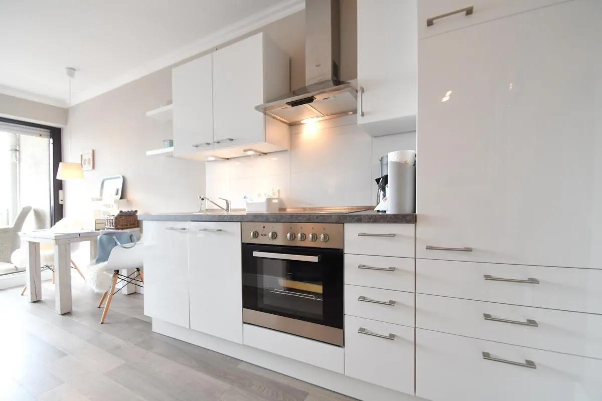 Die weiße Hochglanzküche ist komplett ausgestattet mit Geschirrspüler, 4-Feld-Ceran, Kühlschrank mit Gefrierfach, Backofen.