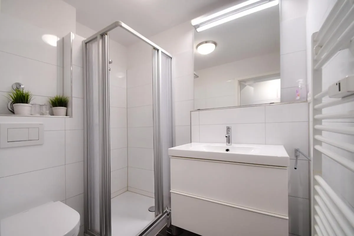 Im Bad können Sie in großen Schubladen Ihre Kosmetik unterbringen, ein Handtuchheizkörper sorgt für zusätzlichen Komfort.