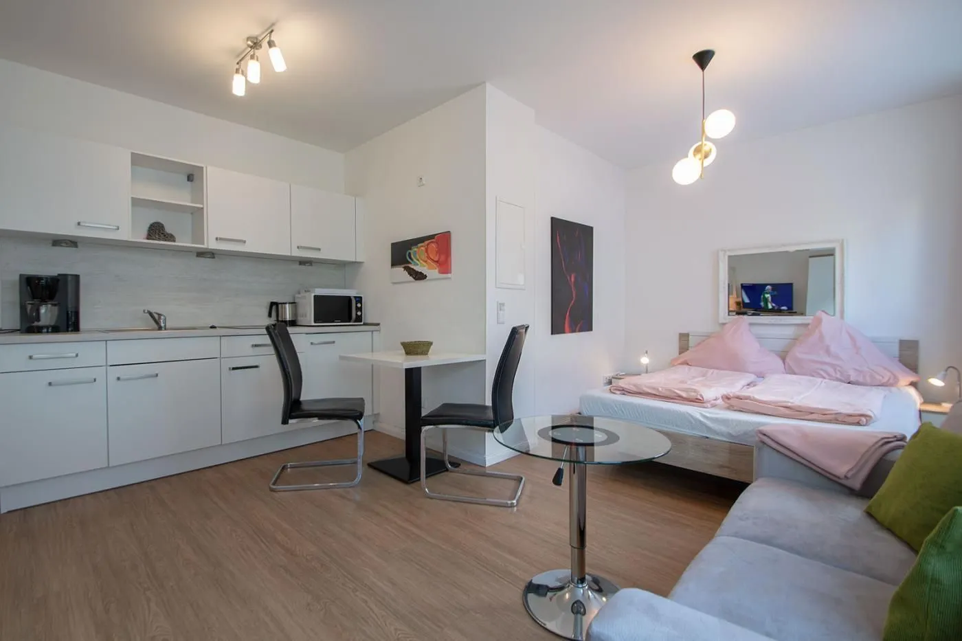Der große Wohnraum mit angrenzendem Schlafbereich ist der Mittelpunkt Ihres Appartements. Neben einem gemütlichen Sofa finden Sie