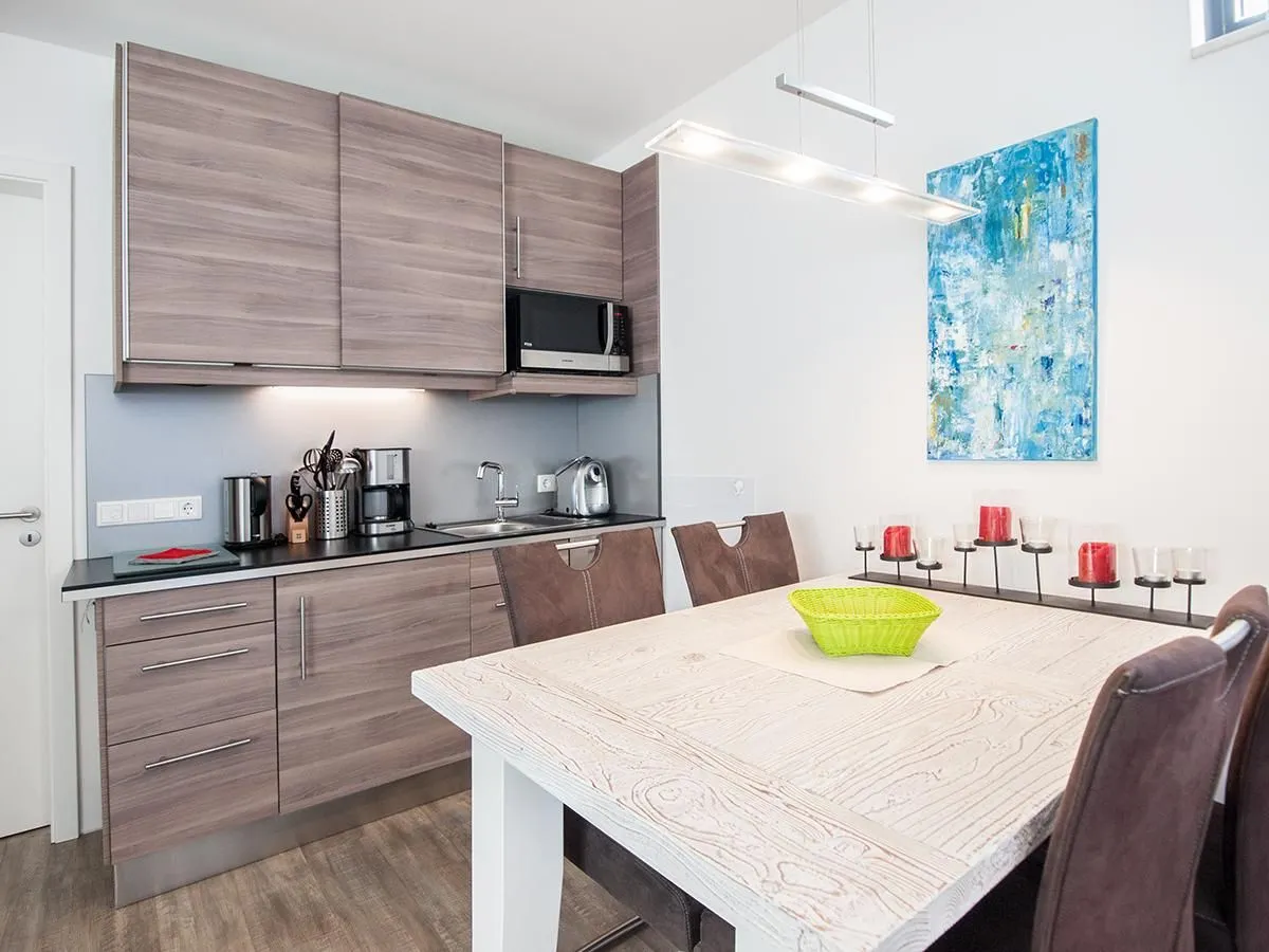 Ihre Ferienwohnung verfügt über eine voll ausgestattete Küche mit Spülmaschine, Induktionskochfeld, Mikrowelle mit Grillfunktion